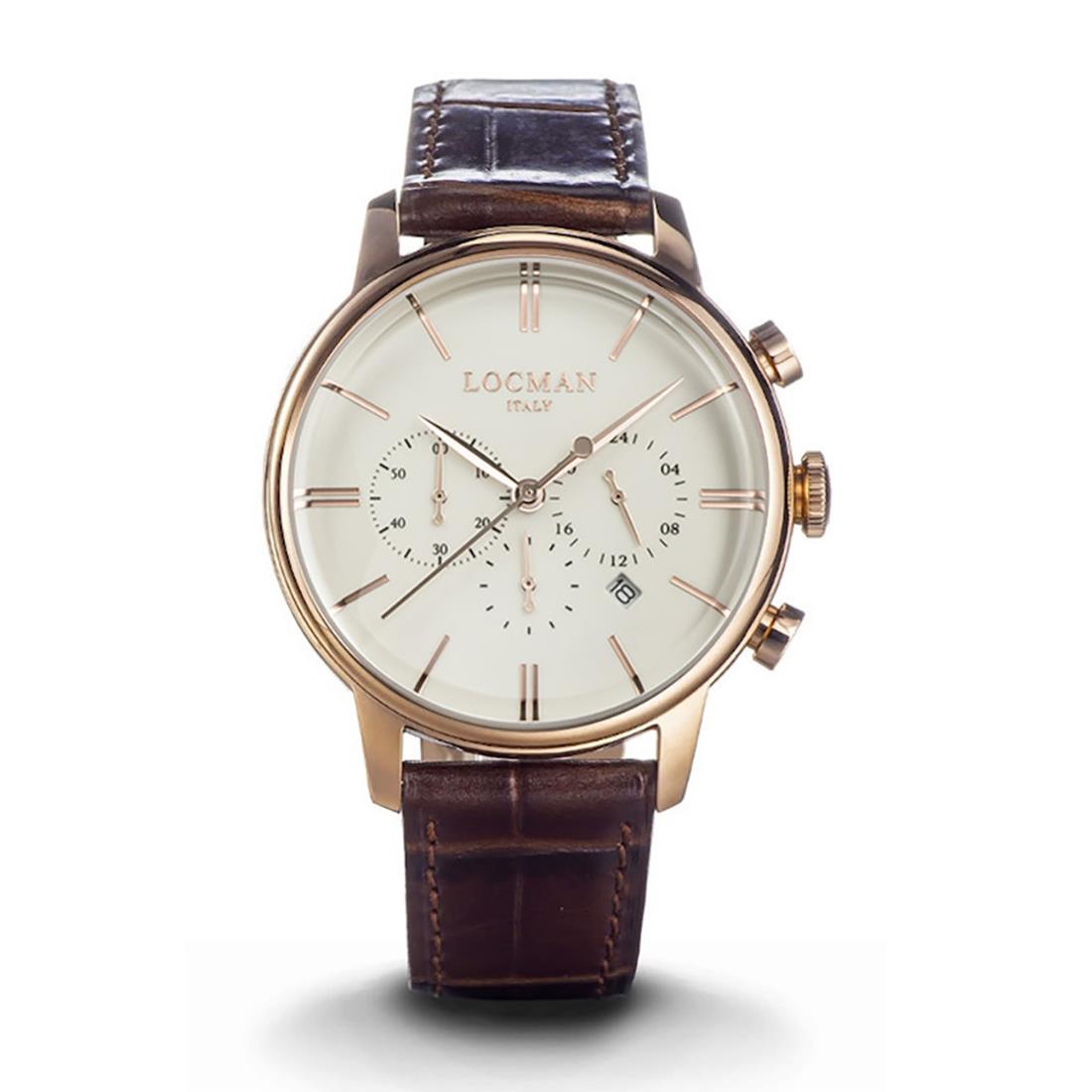 Locman men's watch 1960 collection, with 42mm steel case, pvd treatment, ivory dial, brown leather strap, quartz movement, chronograph and date functions, sapphire-treated mineral glass. Water resistant up to 50m.