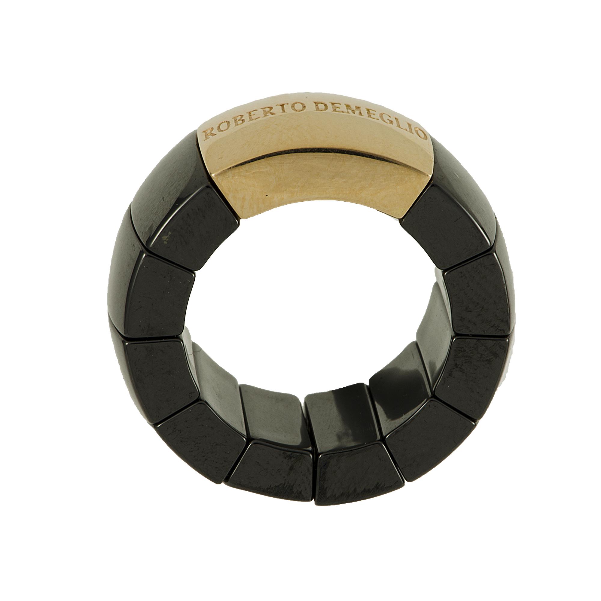 Anello Roberto Demeglio, domino in ceramica nera lucida con logo in oro rosa, sistema allargabile