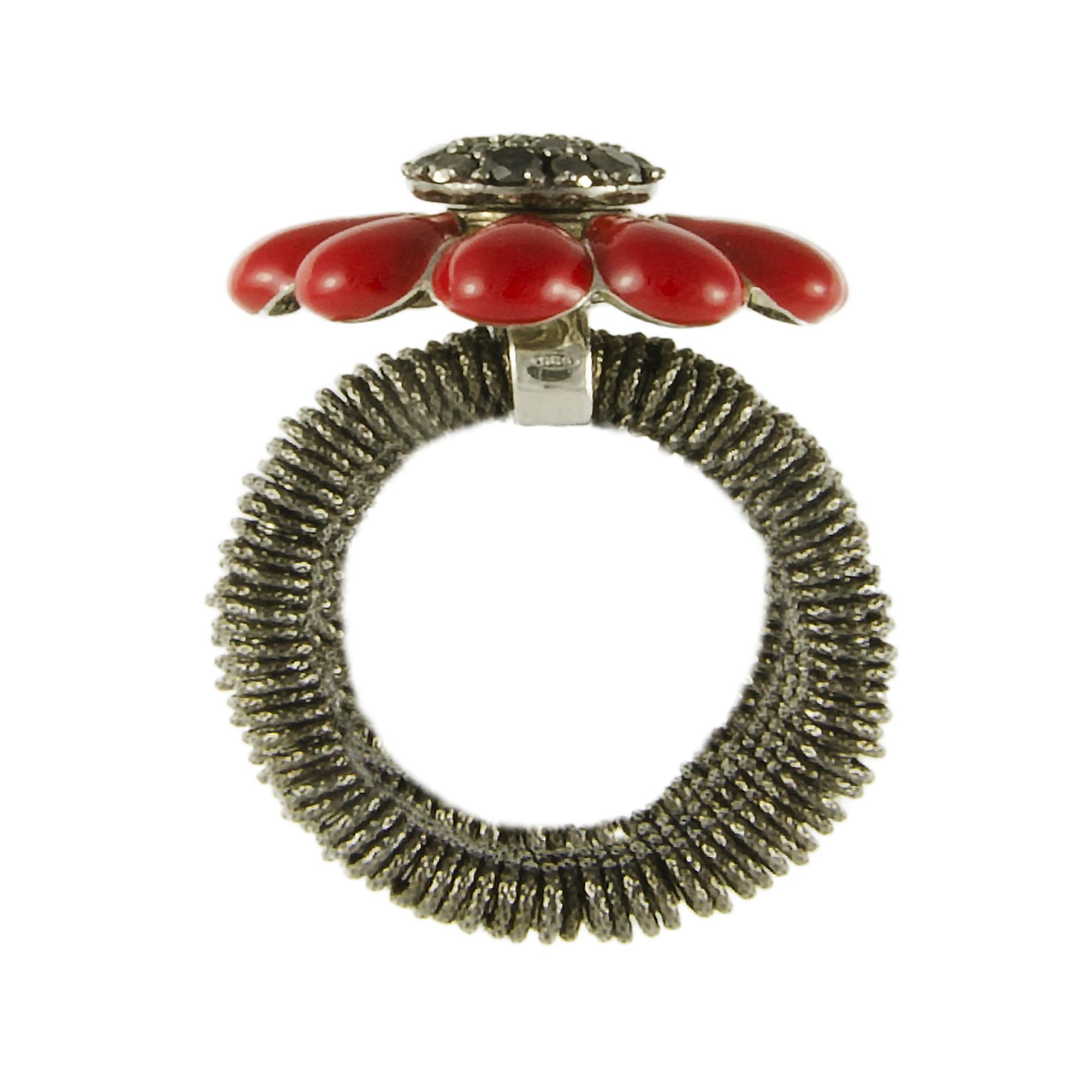Anello Demeglio modello Joy in argento brunito con margherita rossa smaltata e diamanti neri 0,57 carati, misura 13 variabile