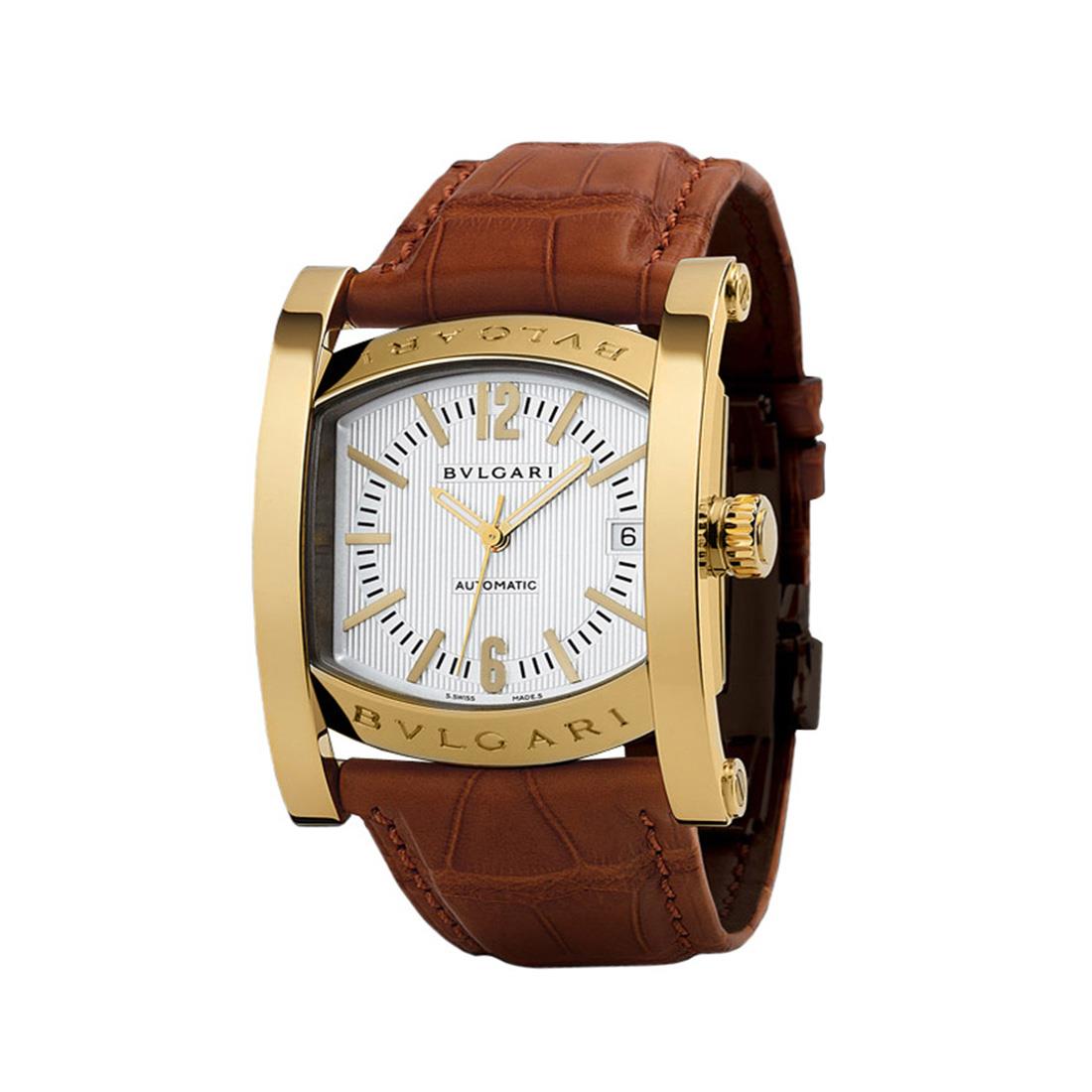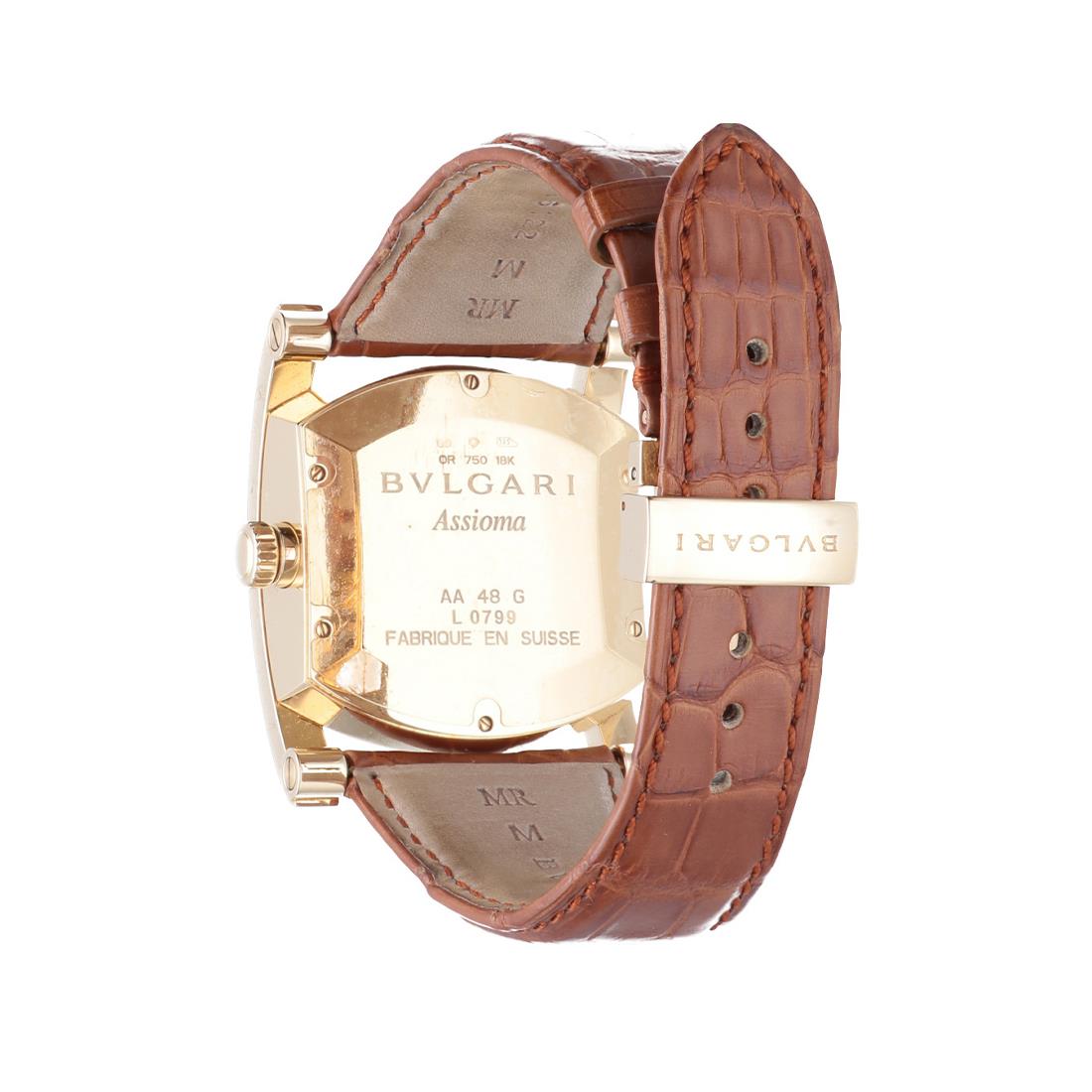 Bulgari Assioma men's watch 48mm 18kt yellow gold case, ivory color dial, brown alligator strap. Water resistance 30m, automatic moviment