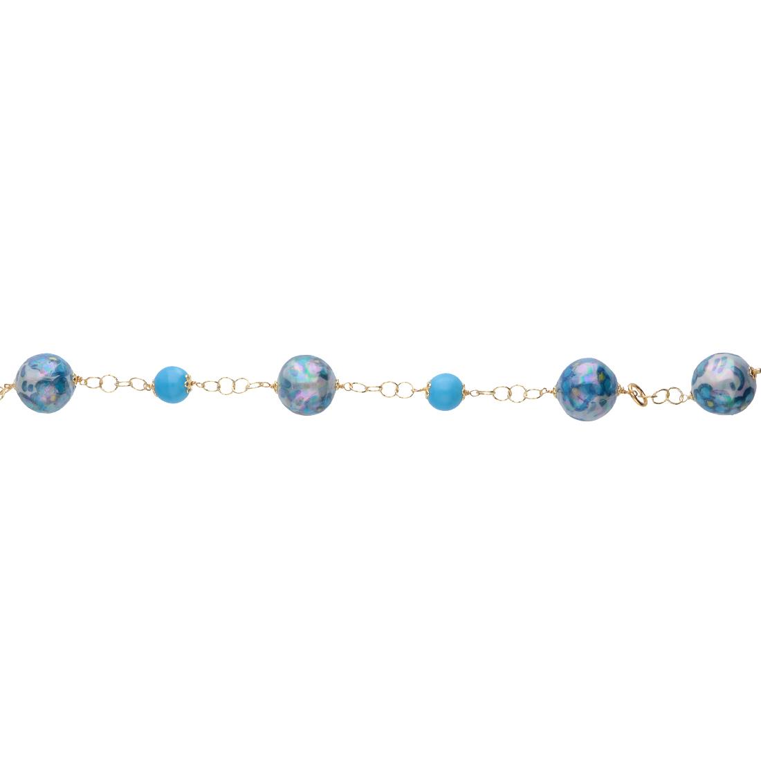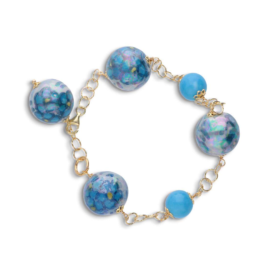 Bracelet Le Perle di Caltagirone in gilded silver with ceramic pearls painted by hand in blue with flower Don’t forget me. Length 21 cm. Pearls diameter of 16 mm and 10 mm.