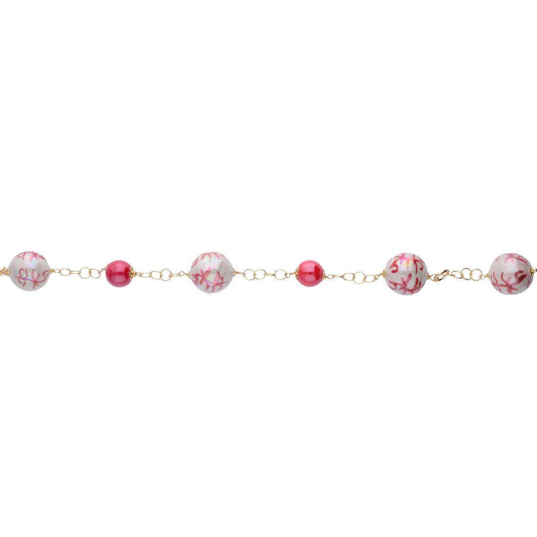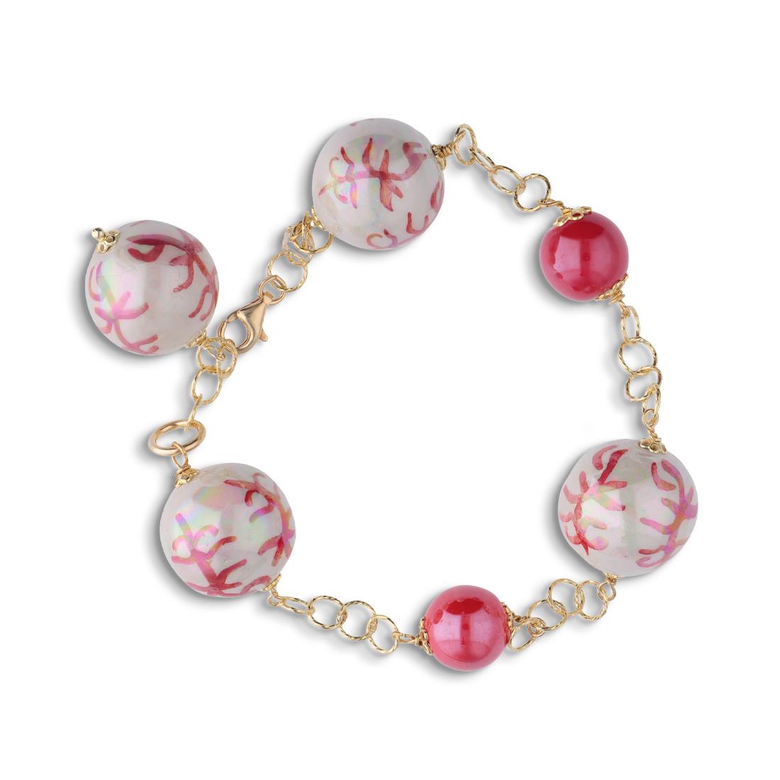 Bracelet Le Perle di Caltagirone in gilded silver with ceramic beads painted by hand red and white with corals. Length 21 cm. Pearls diameter of 16 mm and 10 mm.
