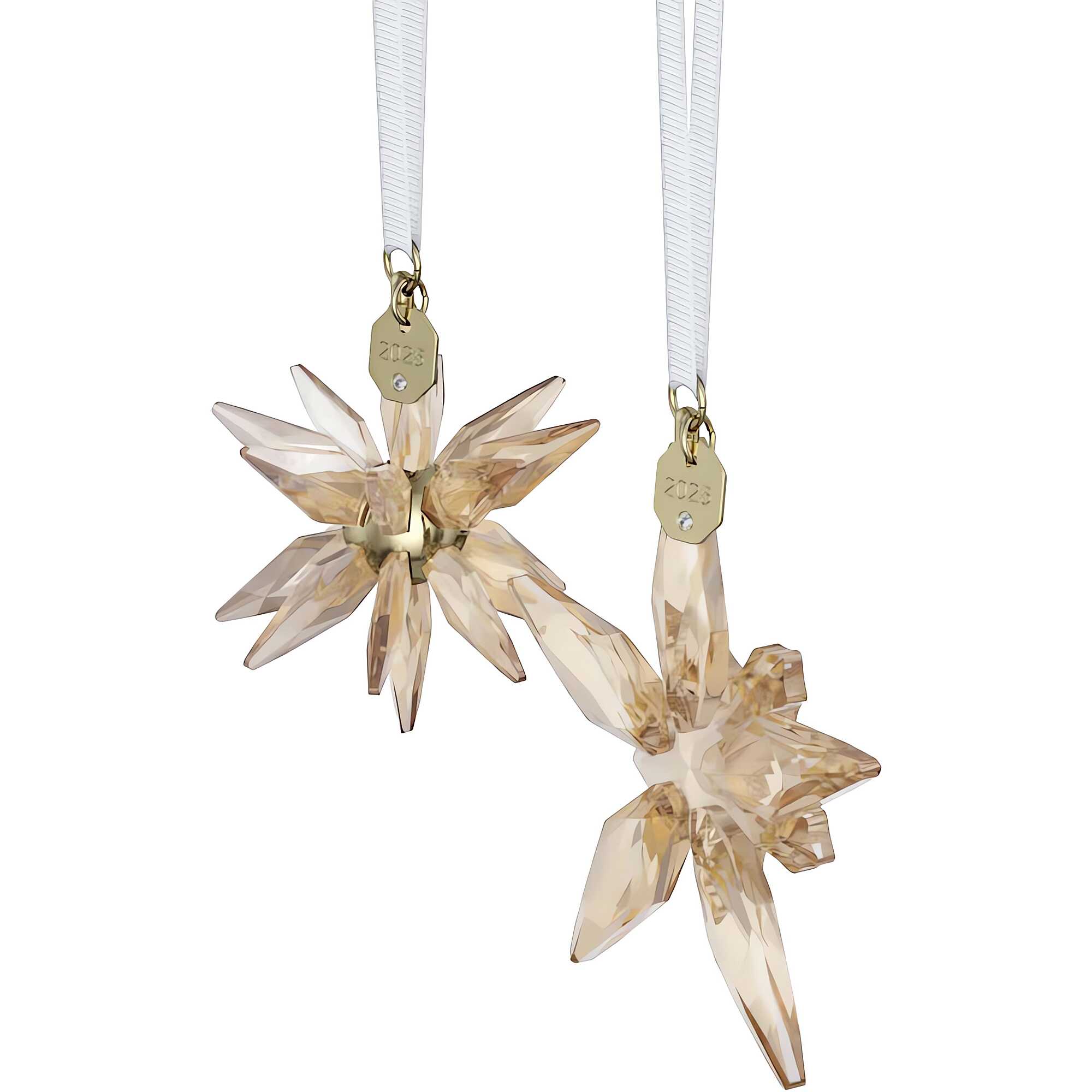 Swarovski decorations from the Stella Annual Edition 3D 2025 collection with gold-colored crystals. Size: large 7.7 x 1.3 x 7.2 cm, small 6.1 x 0.8 x 4.6 cm.