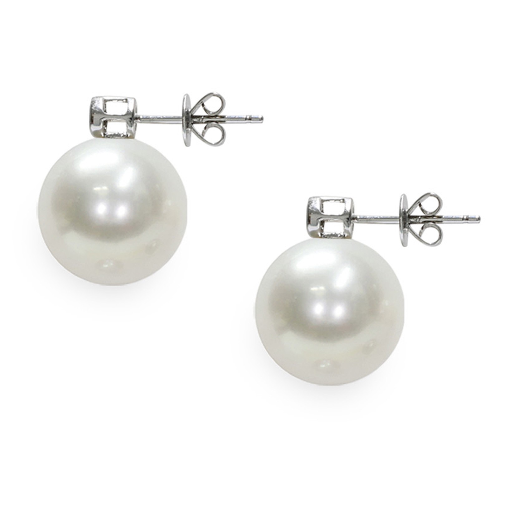 Earrings in 18k white gold (1.00 g) with 0.04 ct diamonds and full Perlagione pearls measuring 7.5×8 mm. A classic, luminous and timeless elegance.