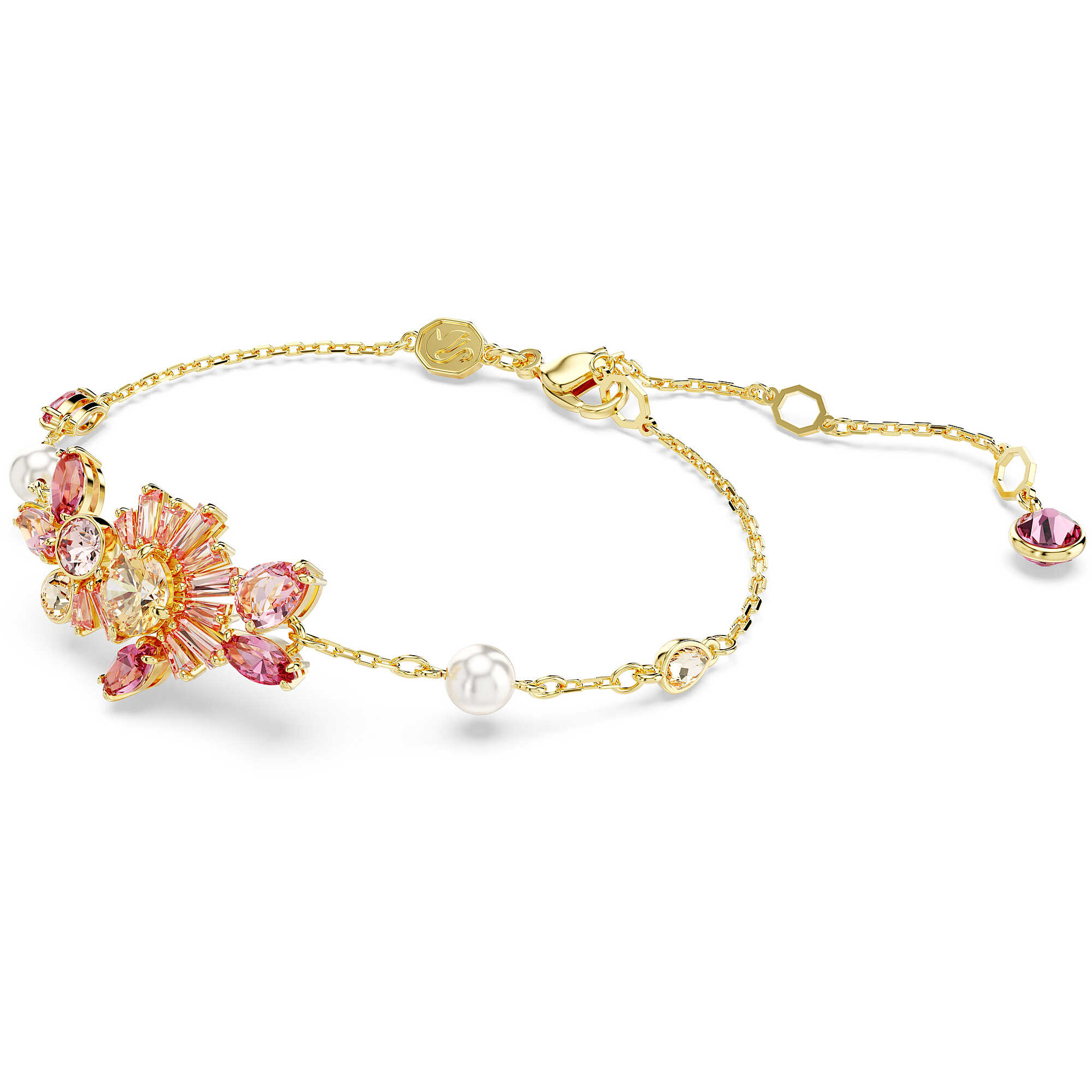 Swarovski bracelet from the Gema collection. Finish in gold tone with pink crystals. Gema Bracelet, Mixed cut, Flower, Pink, Gold-tone plated. Length (minimum - maximum): 15.5 - 19.5 cm