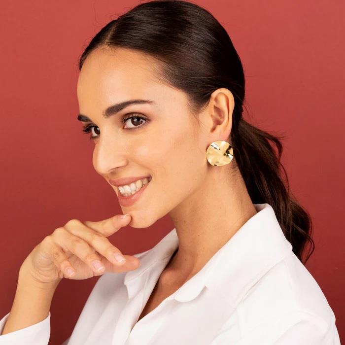 Etrusca Gioielli lobe earrings mounted on a Golden base, 18kt yellow gold plated, embellished with a button shape with a hammered surface worked according to the plate technique; pin and butterfly closure; diameter 3 cm