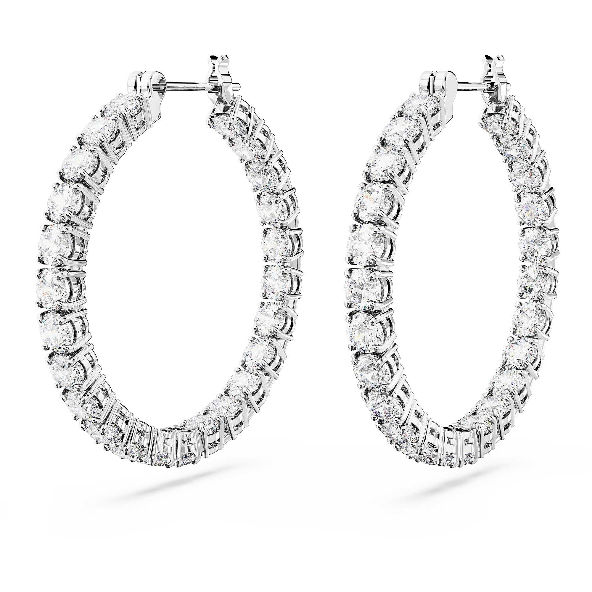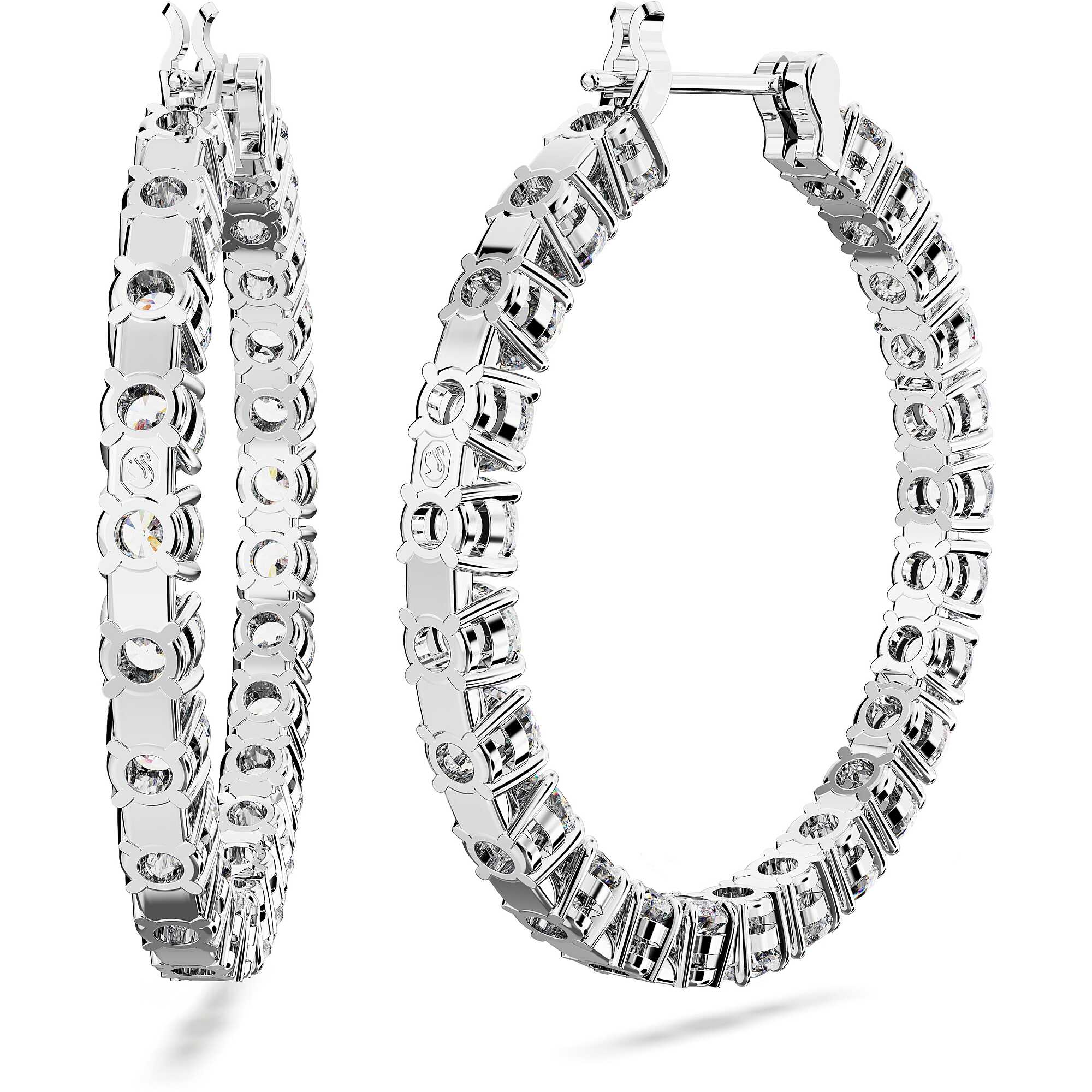 Matrix Hoop Earrings by Swarovski, Round Cut, White, Rhodium Plated. Length: 3cm Width: 3cm These perfectly shaped Matrix hoop earrings are defined by the timeless look of clear round stones and rhodium plated metal. It' a radiant combination and essential for any jewelry box. Choose these earrings to add a touch of brightness to any outfit. The reference is 5647715.