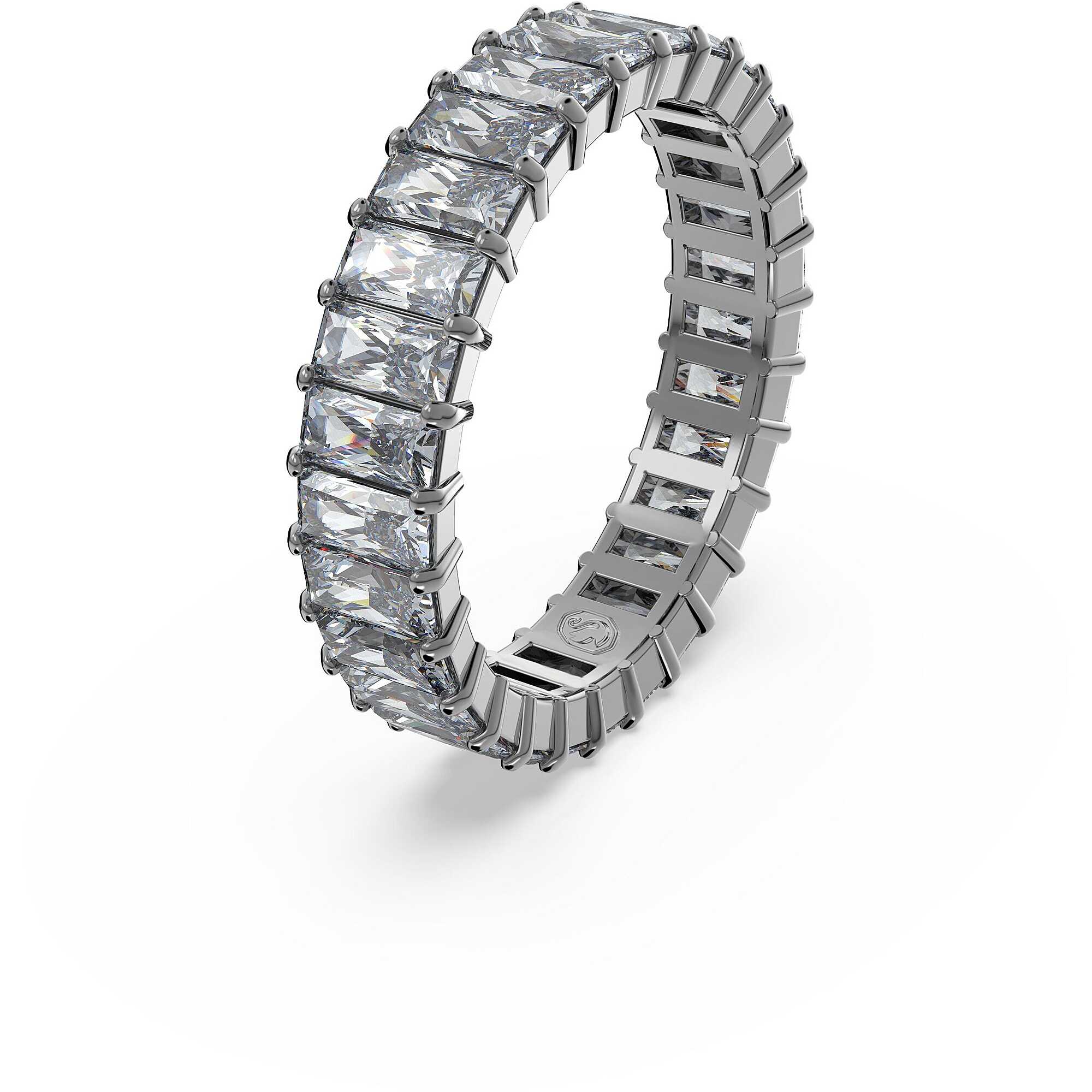 Swarovski Matrix Ring, Baguette Cut, Grey, Ruthenium plated. Size 58 - EU 18. This Matrix ring combines an intense metallic look with a glamorous shine and is a versatile addition to your jewelry box. Baguette Princess cut gray stones are set on a ruthenium-plated band, with a charms workmanship that combines science and magic. A fascinating accessory, perfect for layering with other jewels and creating multiple combinations for all occasions. The reference is 5648915.