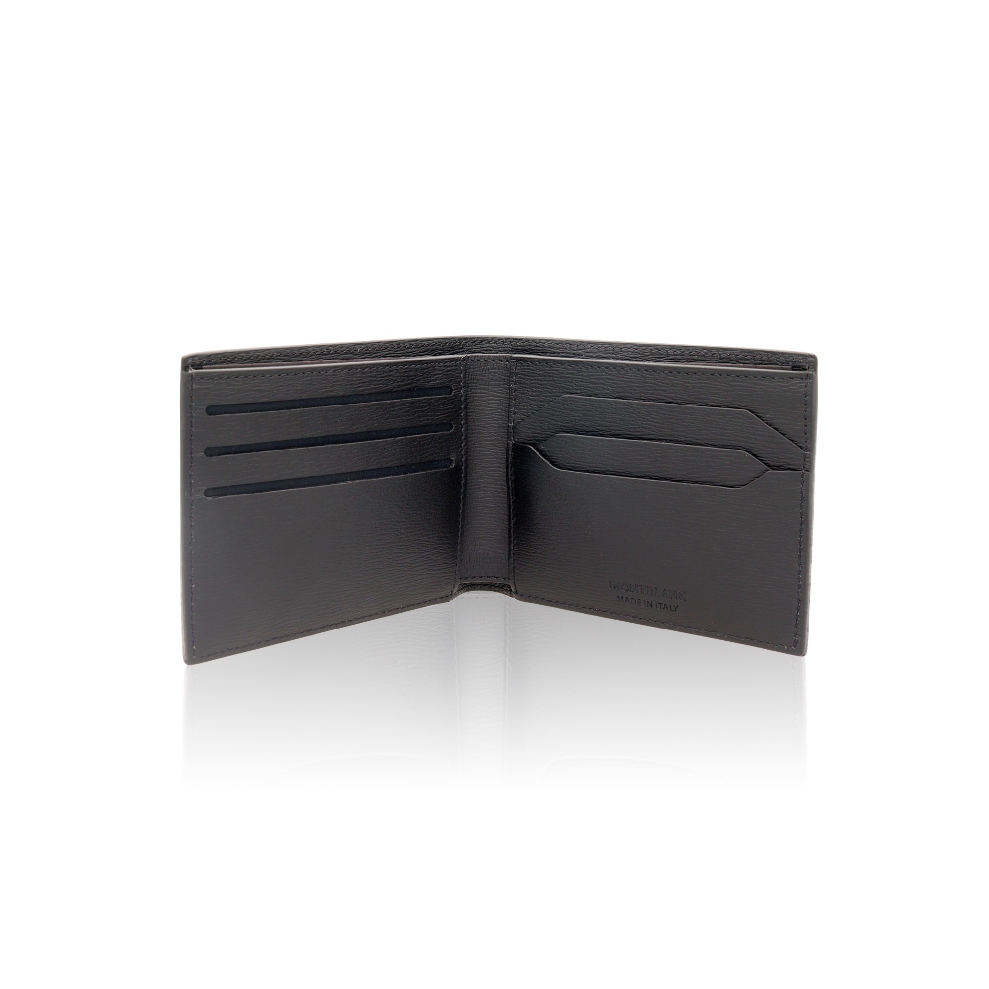 Montblanc wallet Meisterstück collection with 6 credit card slots made of zero-impact printed leather with ECONYL lining, entirely recycled and infinitely recyclable. The geometric interior design with multiple card slots and pockets for cash and receipts enhances its functionality. Dimensions 110 x 10 x H 90 mm.