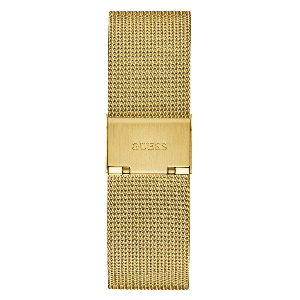 Men's time-only Guess watch from the Idol collection, water-resistant up to 30 m. Champagne sunray dial, 44 mm polished gold-tone stainless-steel case and matching polished gold-tone stainless-steel bracelet with self-adjustable closure. Quartz movement and analog display.