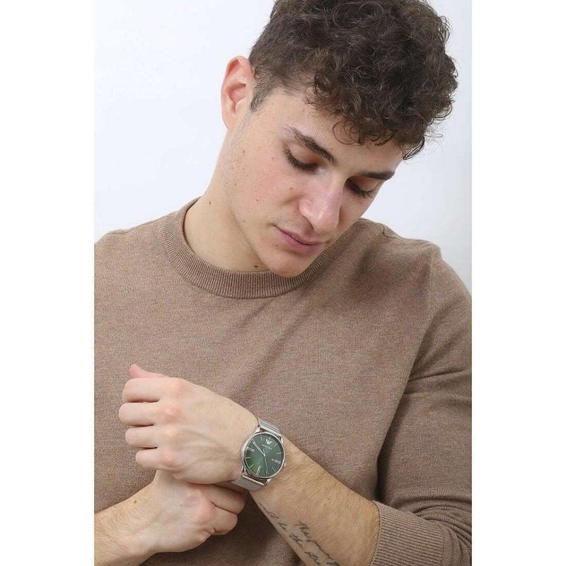 Armani Watch men's watch from the Minimalist collection. Watch with quartz movement / 3 hands and 5 ATM water resistance. The round-shaped case has a diameter of 42 MM, is made of stainless steel with a mixed finish and is silver in colour. The dial is green with transparent glass. The strap is a stainless steel mesh bracelet type with a shiny finish and is silver in color. The closure is a snap safety closure type