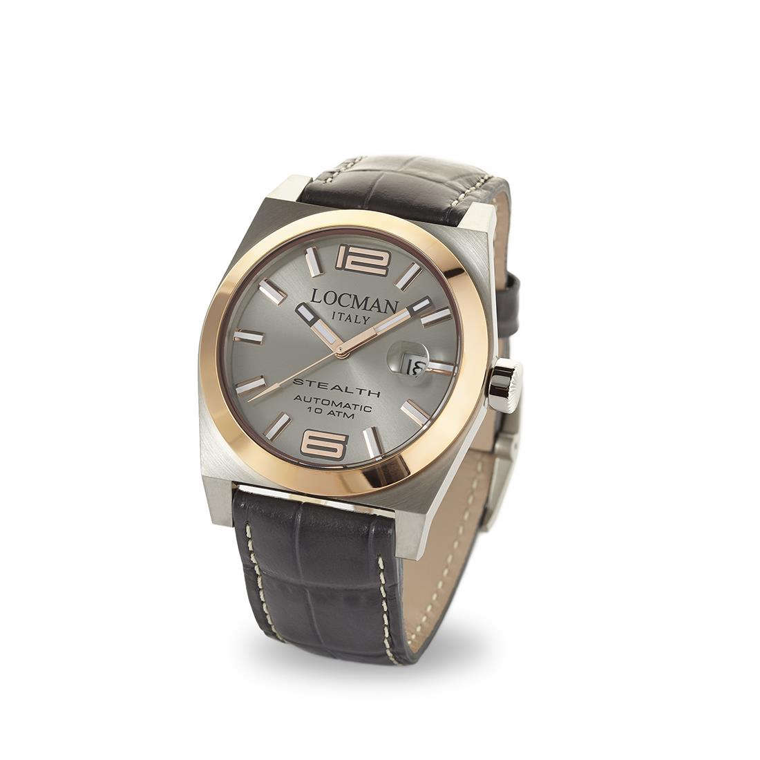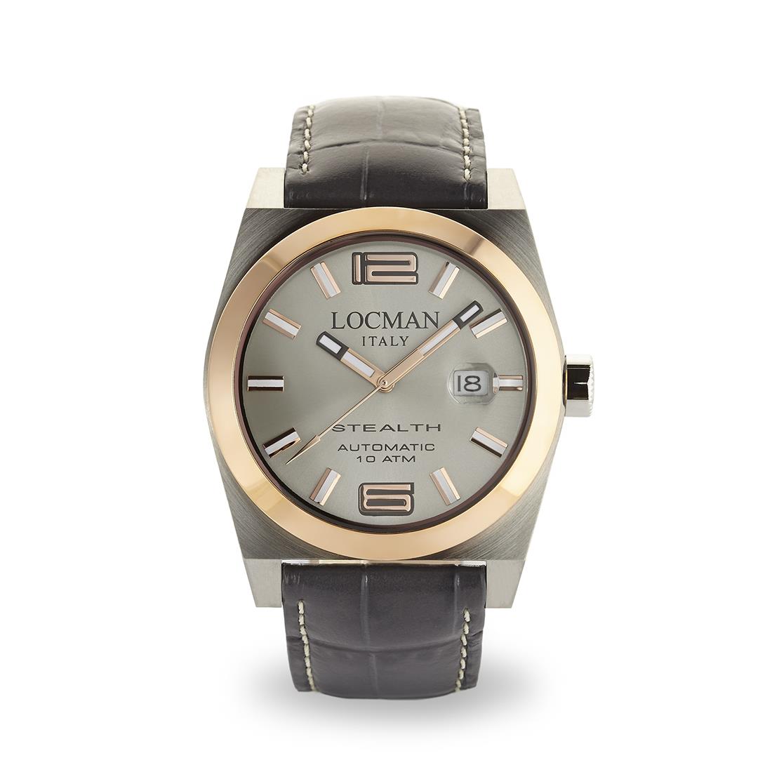 Locman automatic men's watch, Stealth model. The case measures 43 mm and is made of steel and titanium with a rose gold-colored fixed ring. The strap is gray, the glass is made of scratch-resistant natural mineral material and sapphire treatment. The dial is gray and has a date display. Waterproof up to 100 meters. See all the available models