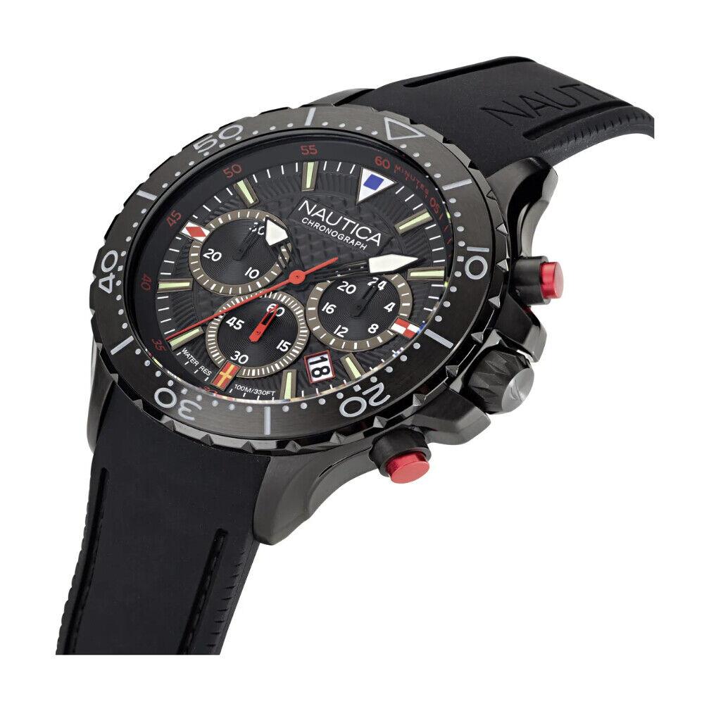 Nautica New nst Chrono watch with 49mm steel case, black silicone strap, chrono quartz movement, water resistant up to 5atm
