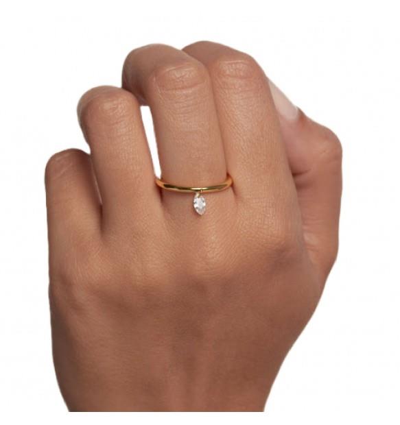 PDPaola solitaire ring in silver with golden finish and oval-cut white crystal pendant, dimensions 6mm x 3mm. Size 10