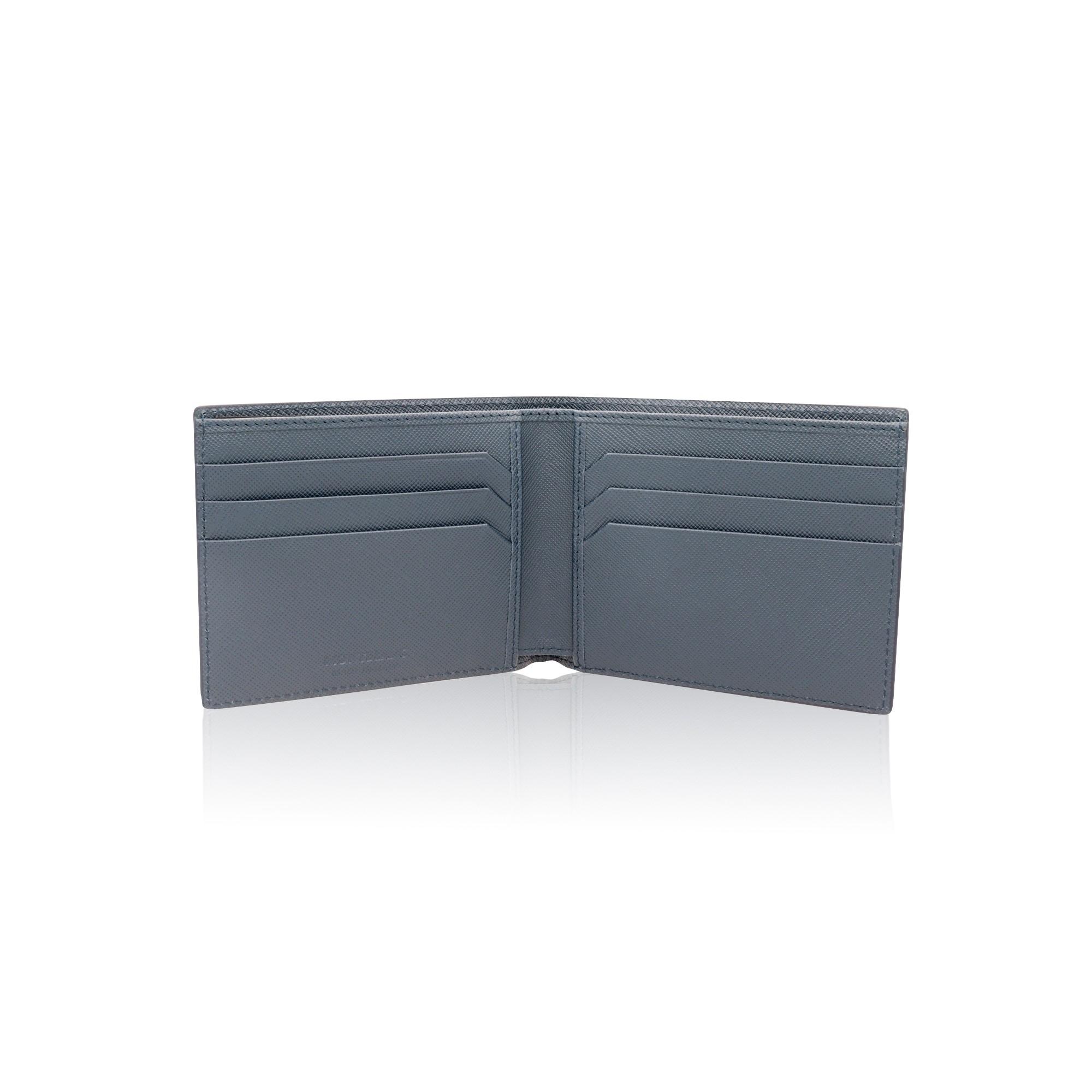 Montblanc wallet Sartorial collection in blue calf leather with Saffiano print. Holds up to 6 credit cards, banknotes in two compartments and additional documents in two extra pockets. Dimensions 115 x 10 x 92 mm.