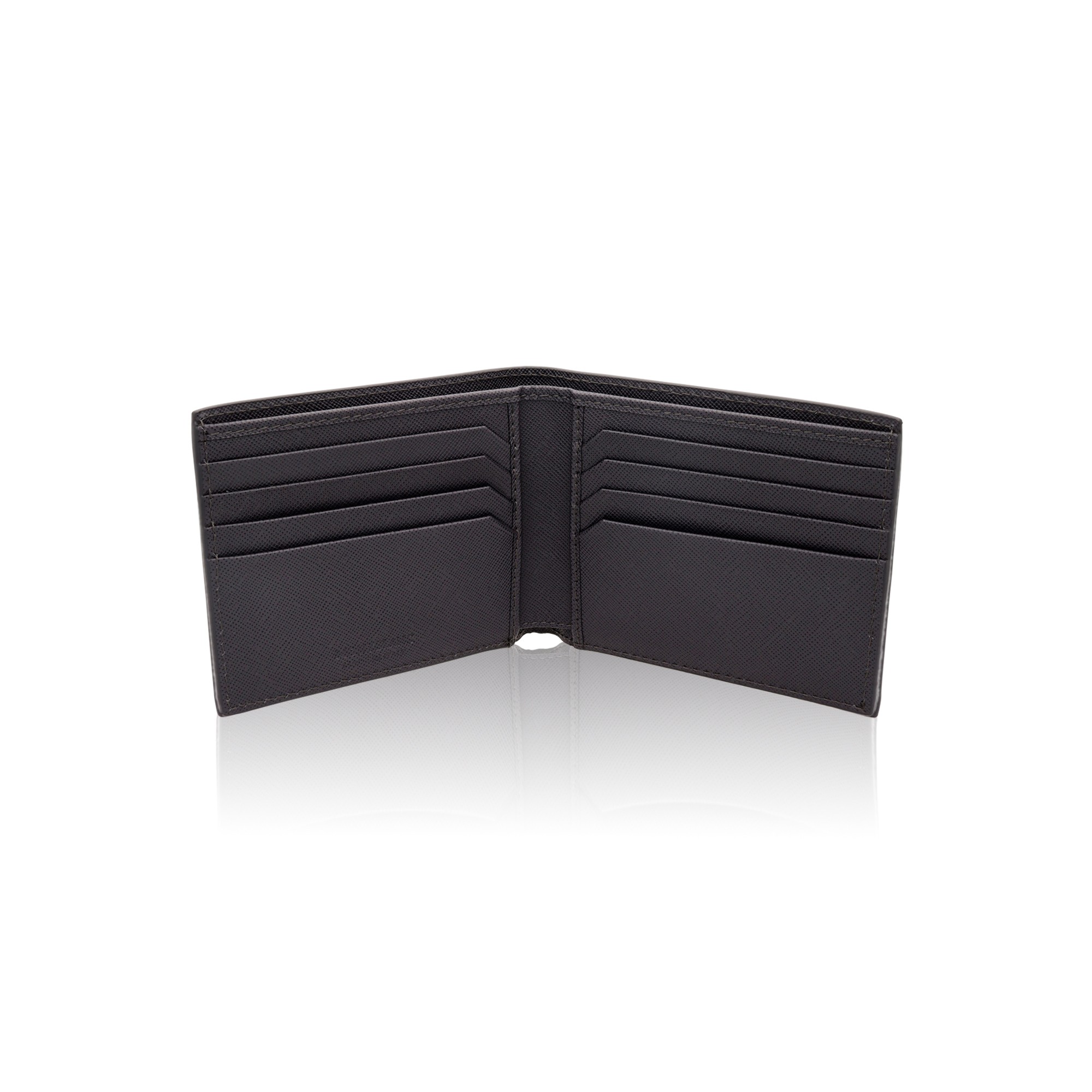 Montblanc wallet Sartorial collection with 8 compartments in graphite full-grain calf leather with Saffiano print. Cotton and polyamide lining. Size 105 x 10 x 95 mm.