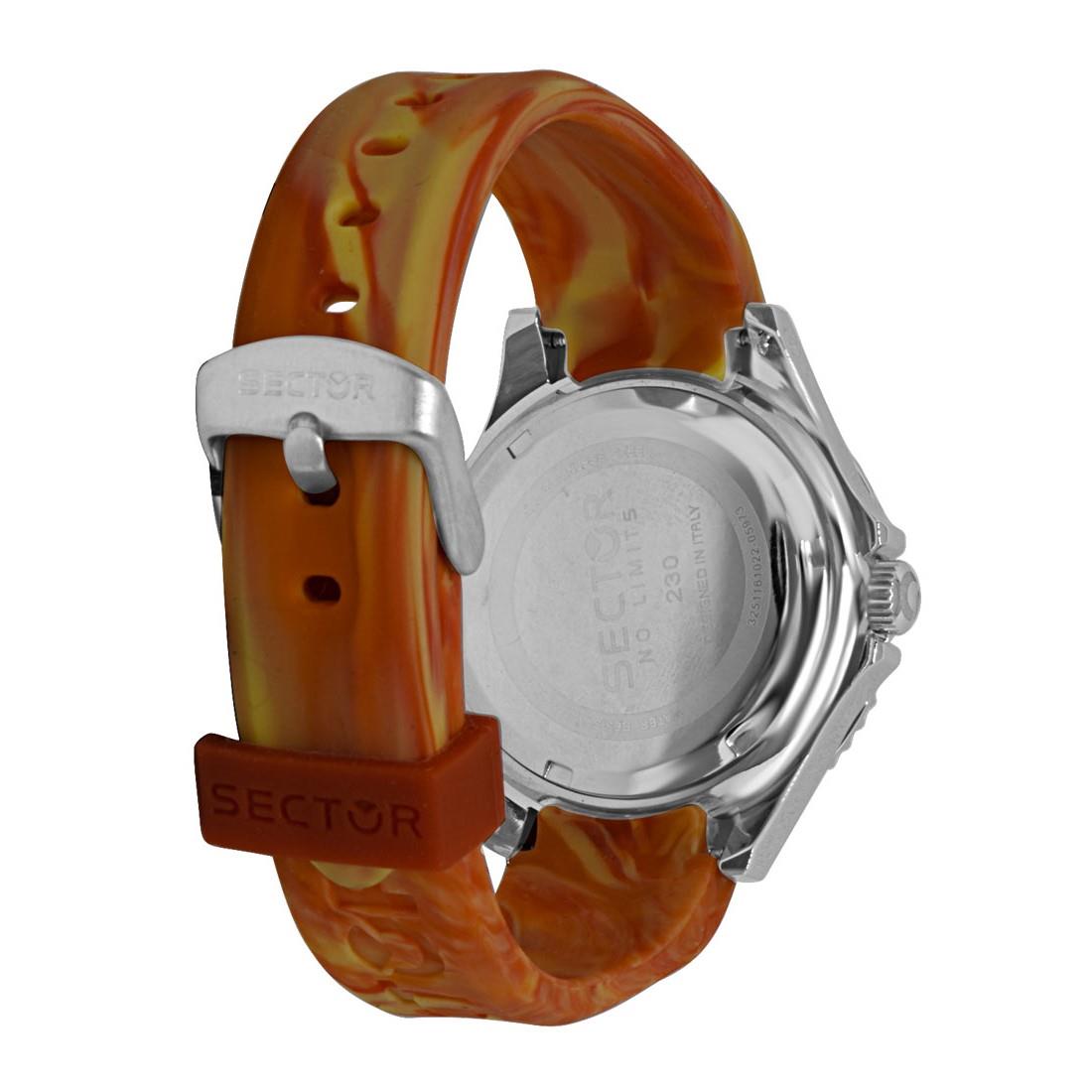 Sector men's watch 230, 39mm case in stainless steel, dial color: black, mineral glass, silicone strap, orange color, quartz movement, water resistant 10 ATM; look at all the available models