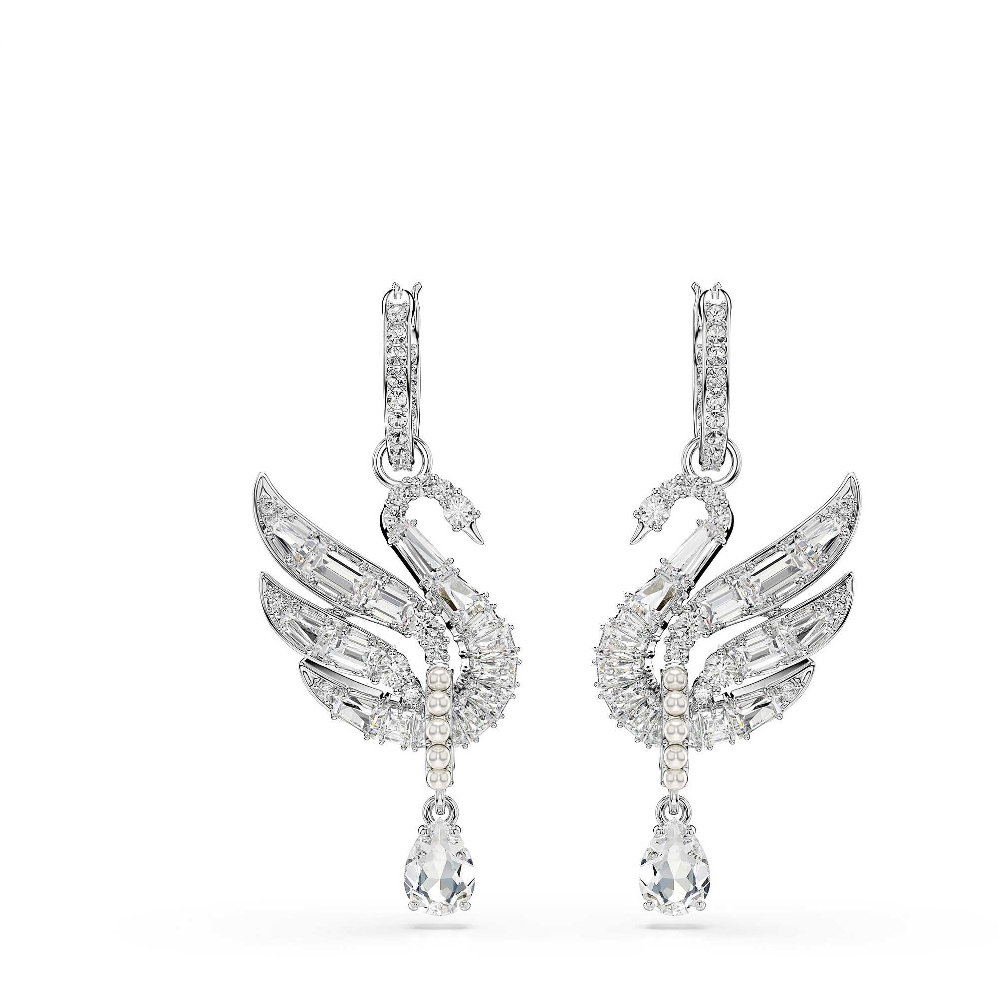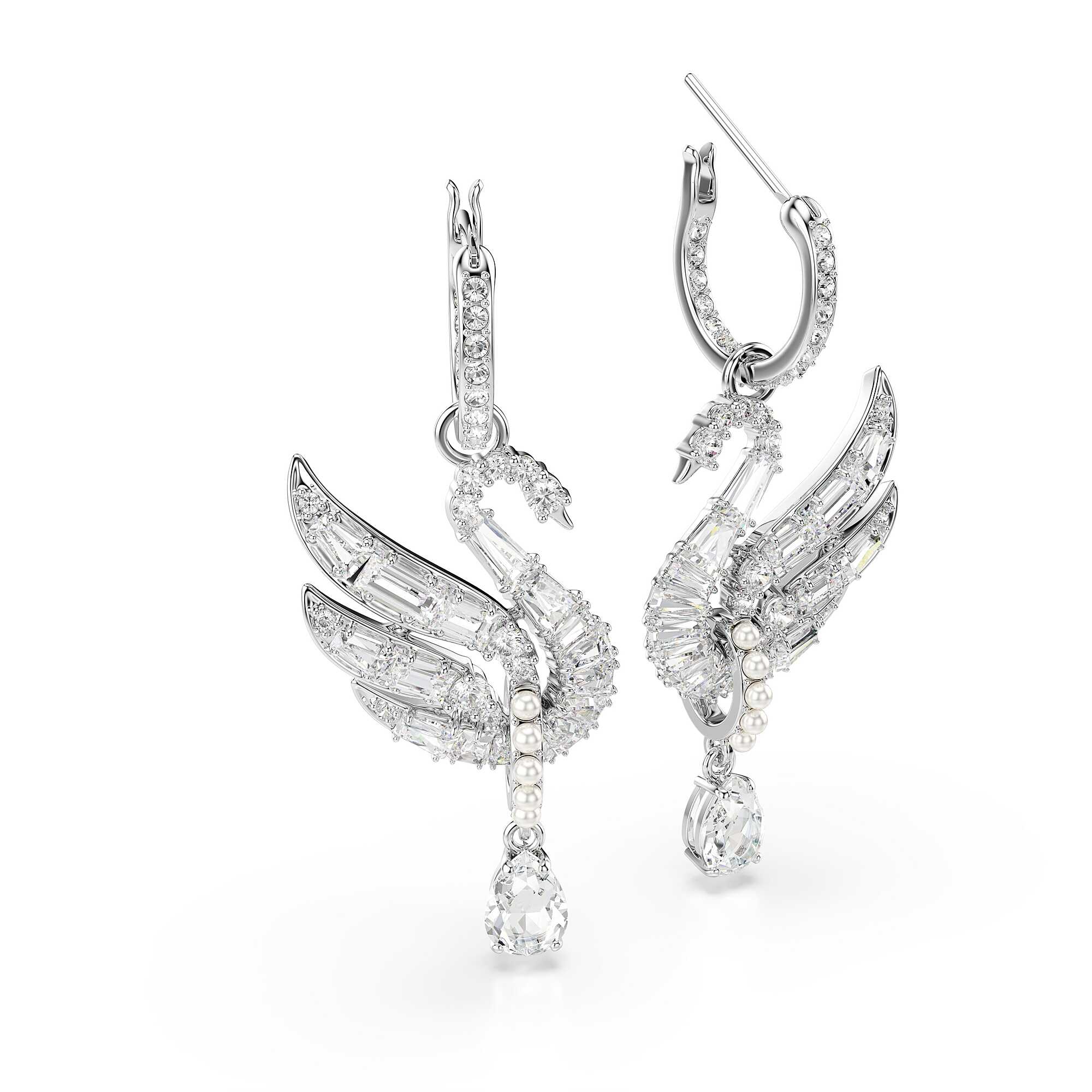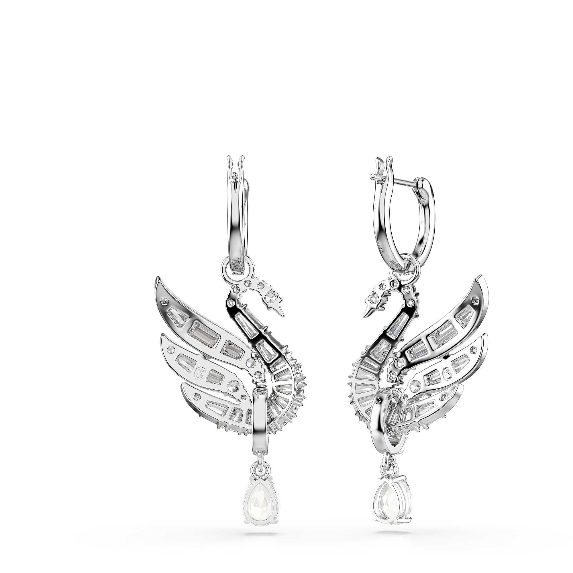 Swarovski Swan Earrings with white swan motif and crystals, rhodium-plated. Size: 4.1 x 1.7 cm