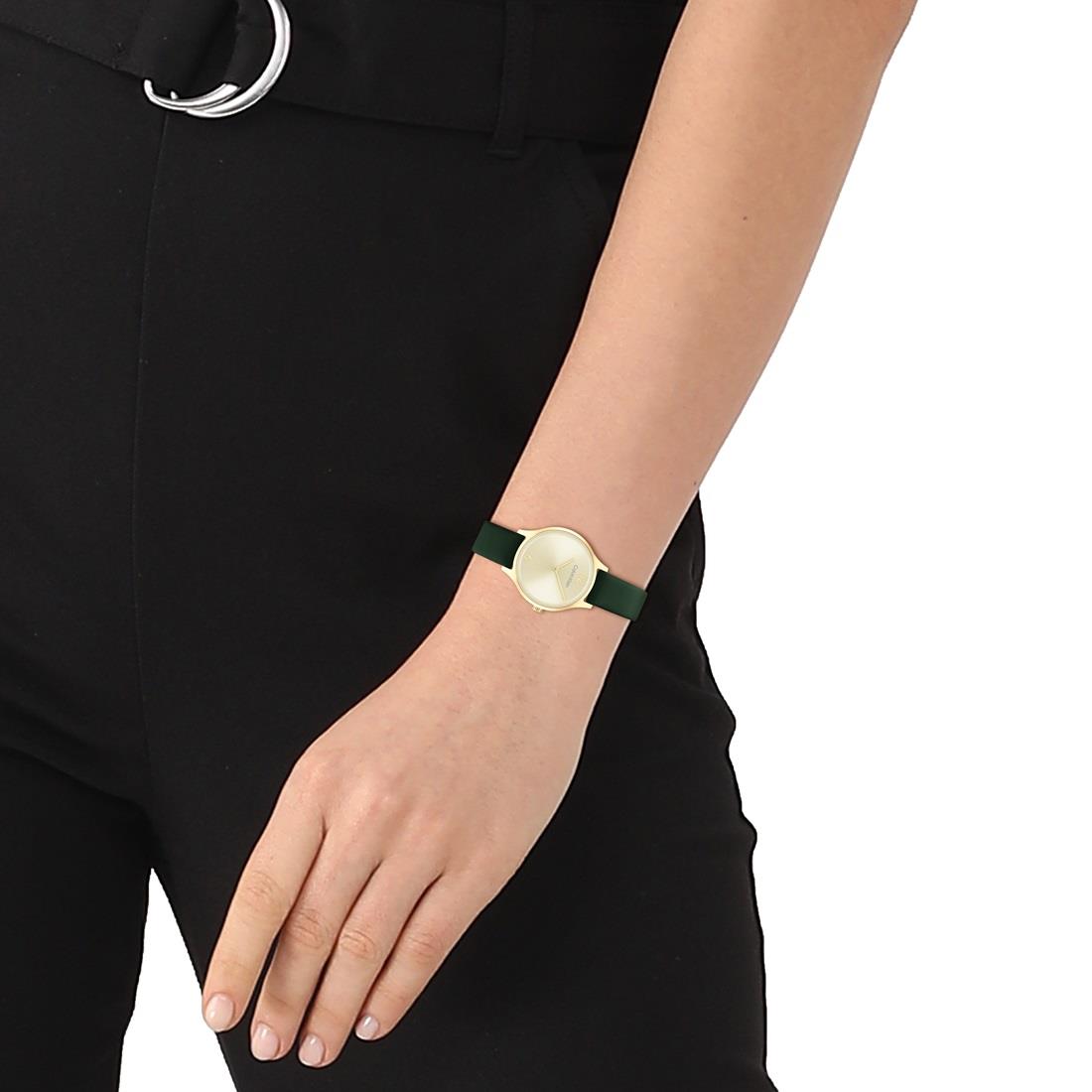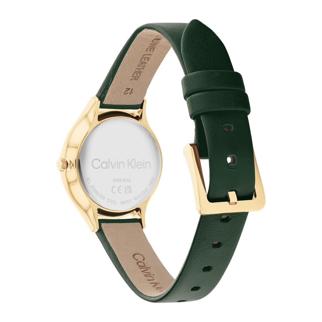 Calvin Klein Timeless women's watch, 28mm gold-plated steel case, golden dial with Arabic numeral hour markers at e12 and 6, green leather strap. Quartz movement, water resistant up to 3ATM.