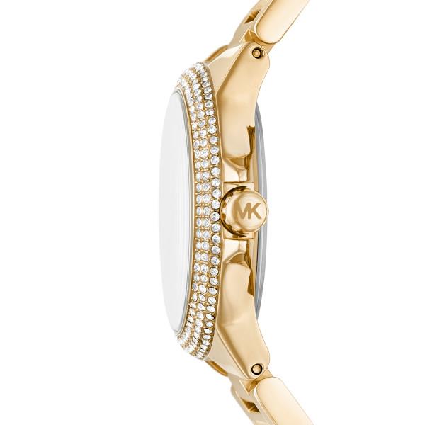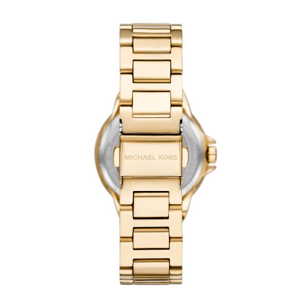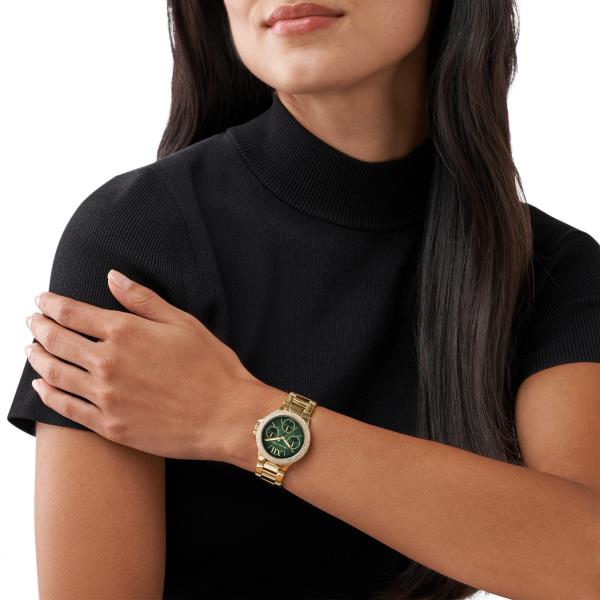 Michael Kors watch with 37 mm steel case in gold colour, green dial and steel band. Water resistant up to 50 m and quartz movement.