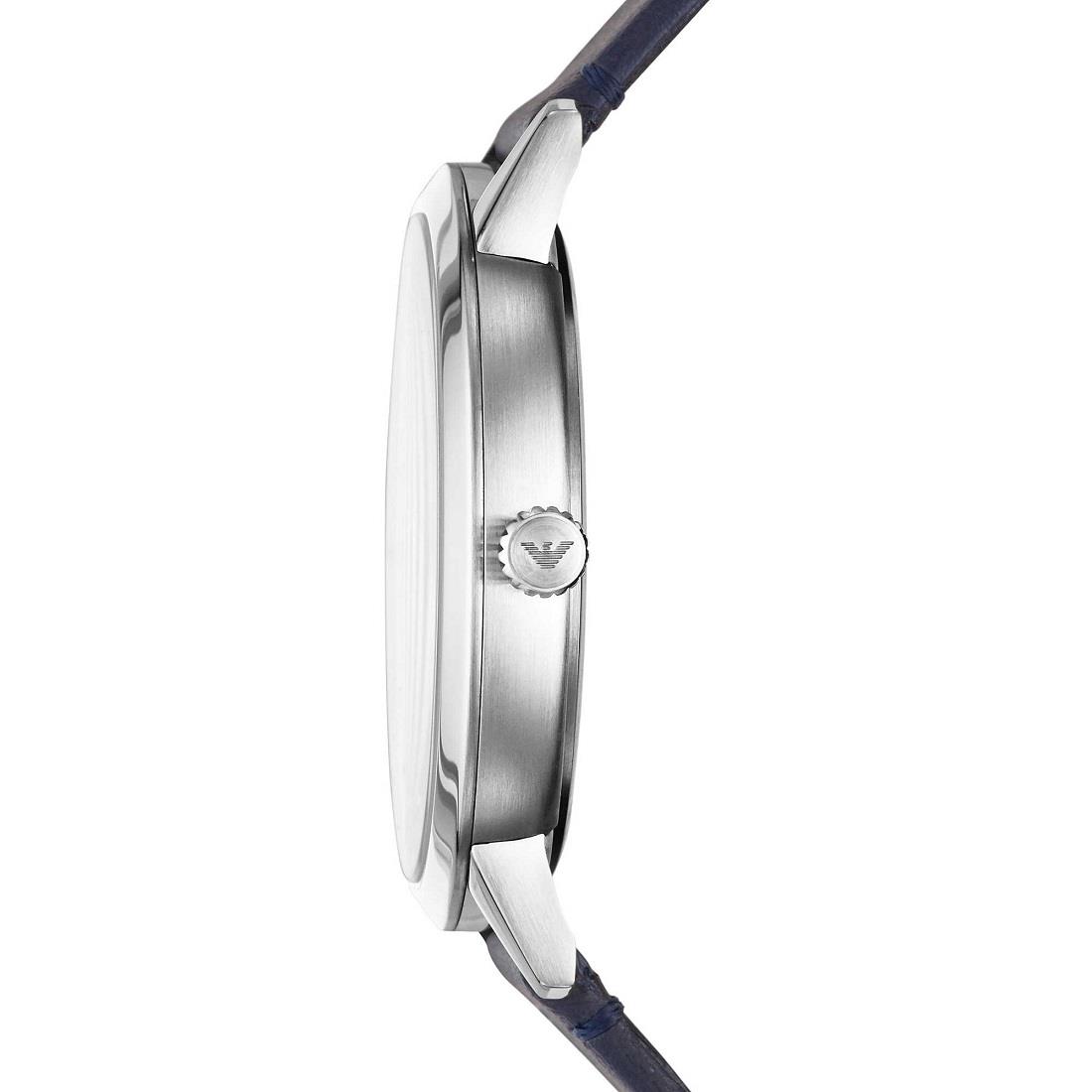 Emporio Armani watch with 43 mm steel case in silver colour, blue leather band and dial in silver colour. Quartz movement and 3atm water resistant.
