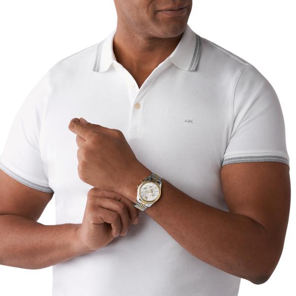 Michael Kors watch with 45 mm case in gold colour, silver dial and steel band. Water resistant up to 30 m and quartz movement.
