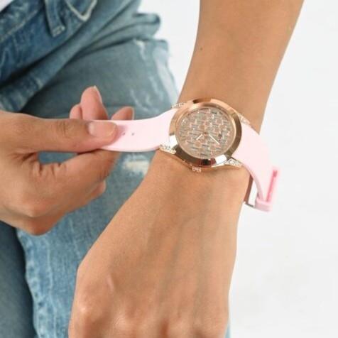 Guess women's watch, 39mm case in pink steel, bezel with white zircons, rose gold dial with pavé of baguette zircons and stick indexes, pink silicone strap. Quartz movement, water resistant up to 3ATM