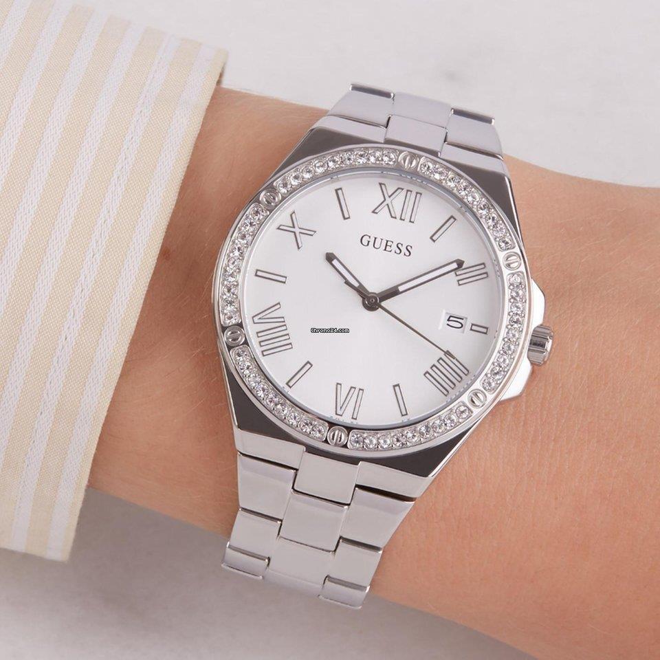 Guess women's watch, 38mm silver steel case, silver steel dial with baton indexes alternating with Roman numerals and date display at 3 hours, bezel with white zircons, steel strap. Quartz movement.
