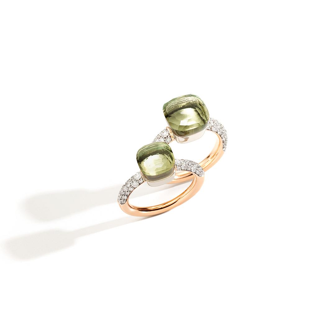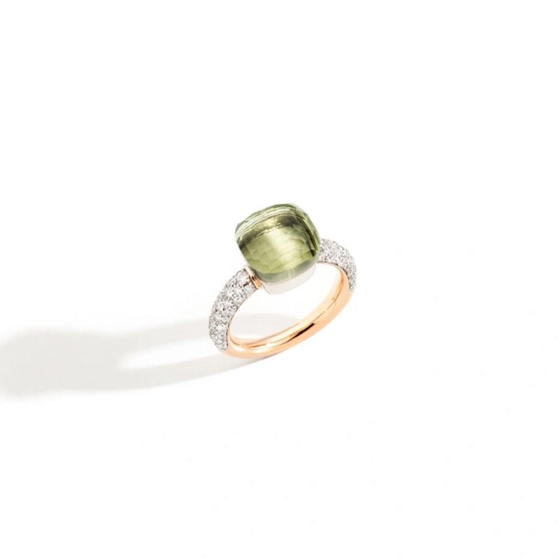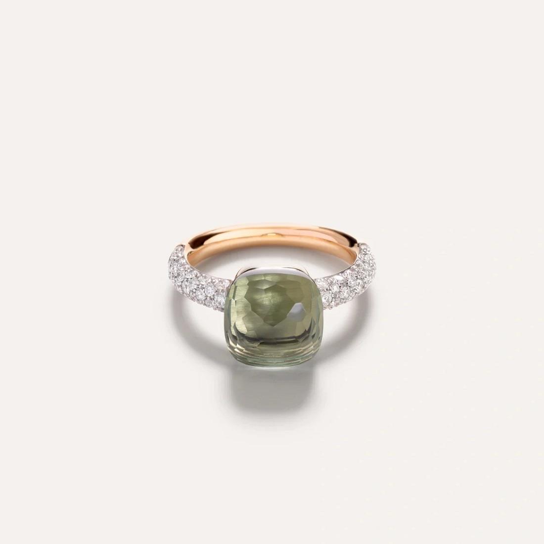 Anillo Pomellato colección Nudo Classic de oro rosa y bisel de oro blanco, con prasiolita de 1 ct y diamantes ct. 0.73. Talla 12.
