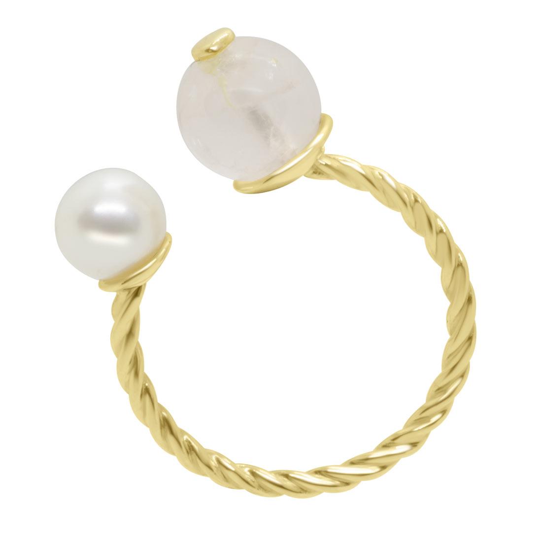 Anillo abierto en oro amarillo con perla y cuarzo rosa med 15