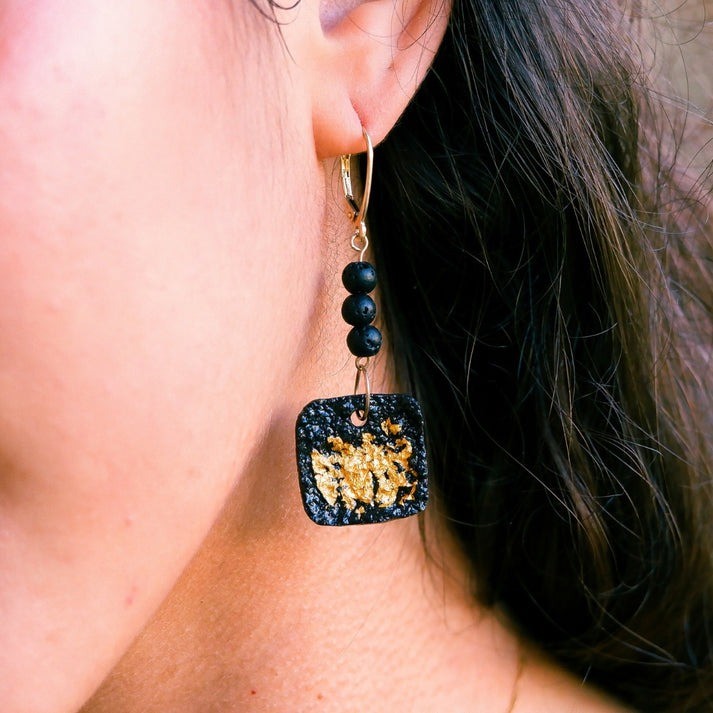 lapilli de piedra volcánica del Etna y escamas de oro de 24K. Longitud total del pendiente: 5,5 cm. Peso por pendiente: aproximadamente 3,5 gramos.