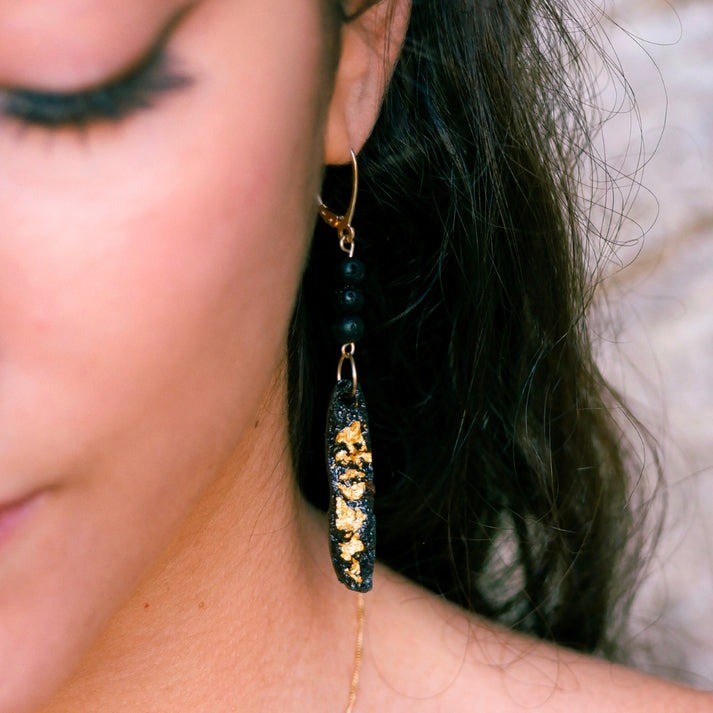 Pendientes Magma Luxury de la colección Foglia con cierre de gancho, elaborados a mano y adornados con lapilli de piedra volcánica del Etna y escamas de oro de 24K. Longitud total del pendiente: 8 cm. Peso por pendiente: aproximadamente 3 gramos.
