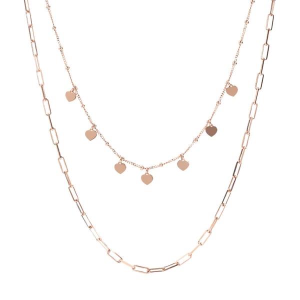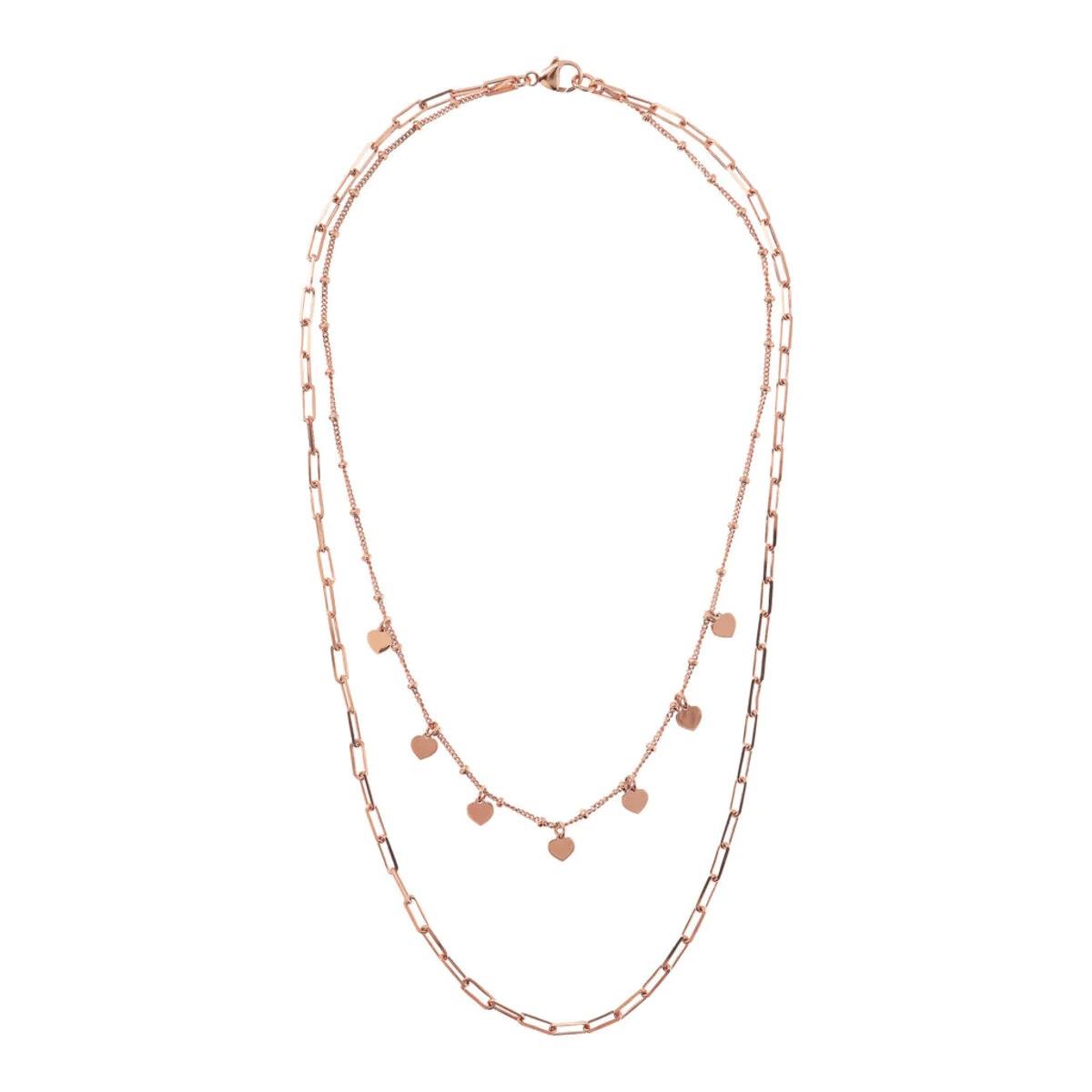Collar Bronzallure realizado con aleación Golden Rosé, con baño de oro rosa de 18kt, con dos vueltas de cadena. El primer collar es una cadena con bolitas y dijes en forma de corazón. El segundo collar es una cadena de cable alargada, con un broche de langosta.