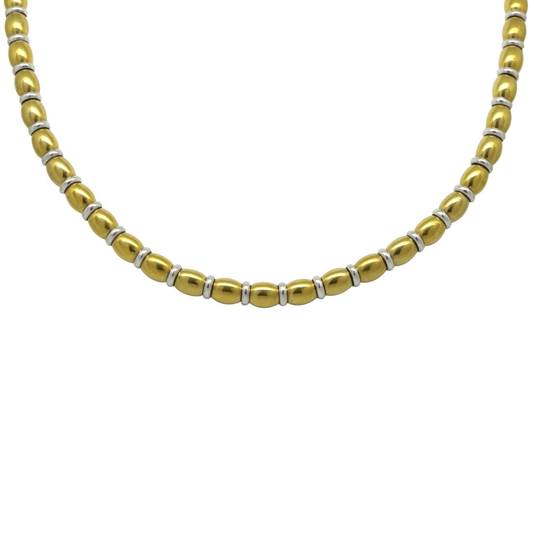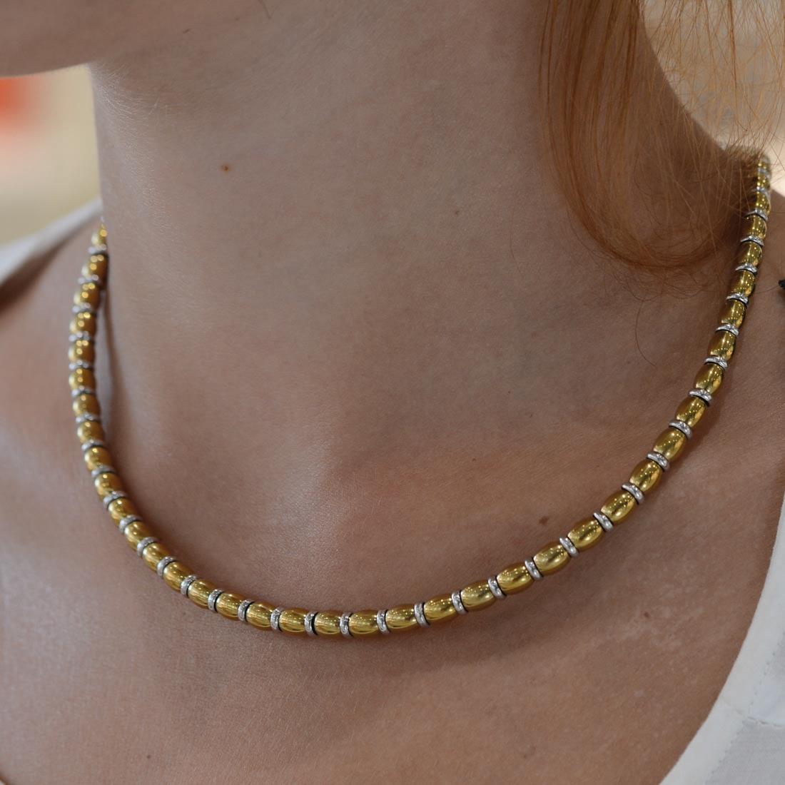 Collar Roberto Demeglio en acero dorado con círculos de oro blanco. Longitud 40 cm