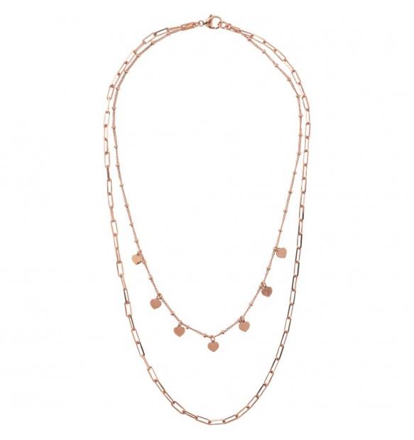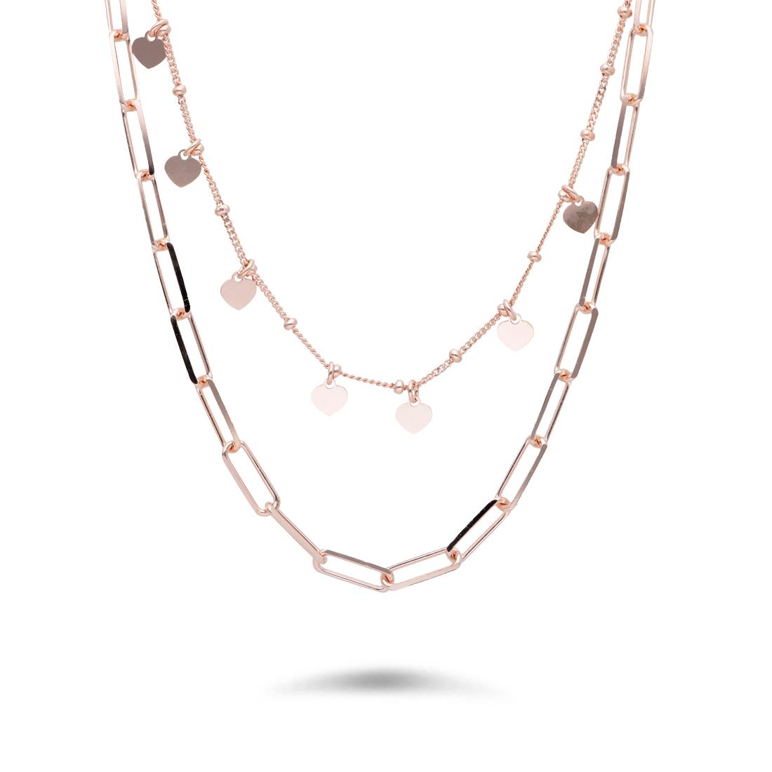 Collar Cadena Forzatina Multivueltas y Rosario con Dijes de CorazónCollar de varias vueltas Bronzallure elaborado con aleación Golden Rosé, con baño de oro rosa de 18kt, con dos vueltas de cadena. El primer collar es una cadena con bolitas y dijes en forma de corazón. El segundo collar es una cadena de cable alargada, con un broche de langosta.