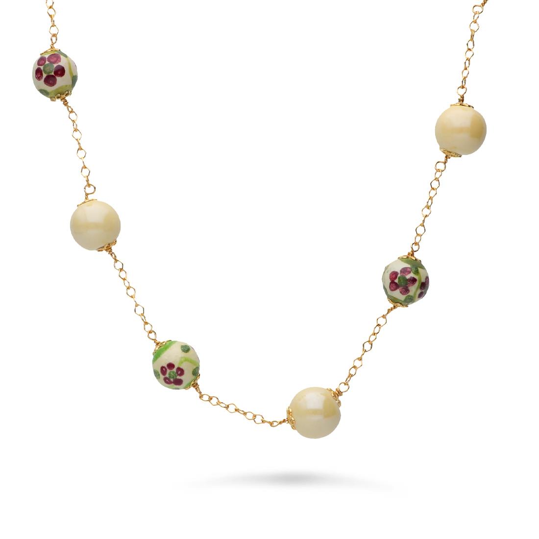 Collar de Le Perle de Caltagirone en plata dorada con perlas de cerámica amarilla con decoraciones de flores pintadas a mano. Longitud 70 cm. Diametro de la perla de 10mm.