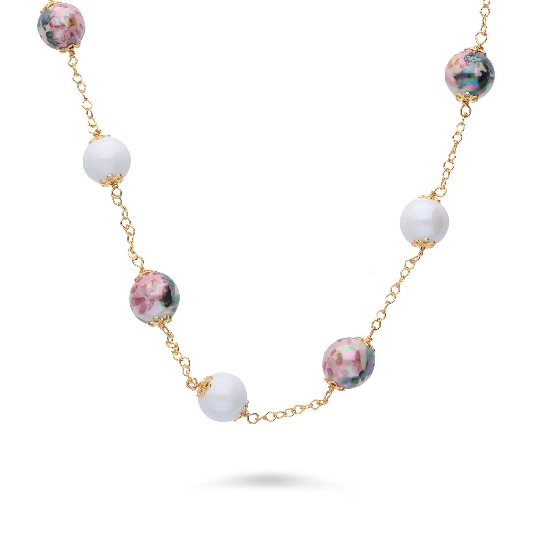 Collar de Le Perle de Caltagirone en plata dorada con perlas de cerámica blanca con decoraciones de flores de Dalia pintadas a mano. Longitud 70 cm. Diametro de la perla de 10mm.