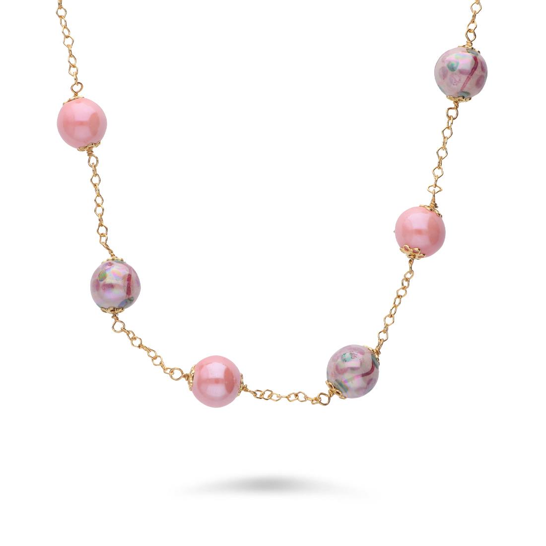 Collar de Le Perle de Caltagirone en plata dorada con perlas de cerámica rosa con decoraciones de flores de Gerbera pintadas a mano. Longitud 70 cm. Diametro de la perla de 10mm.