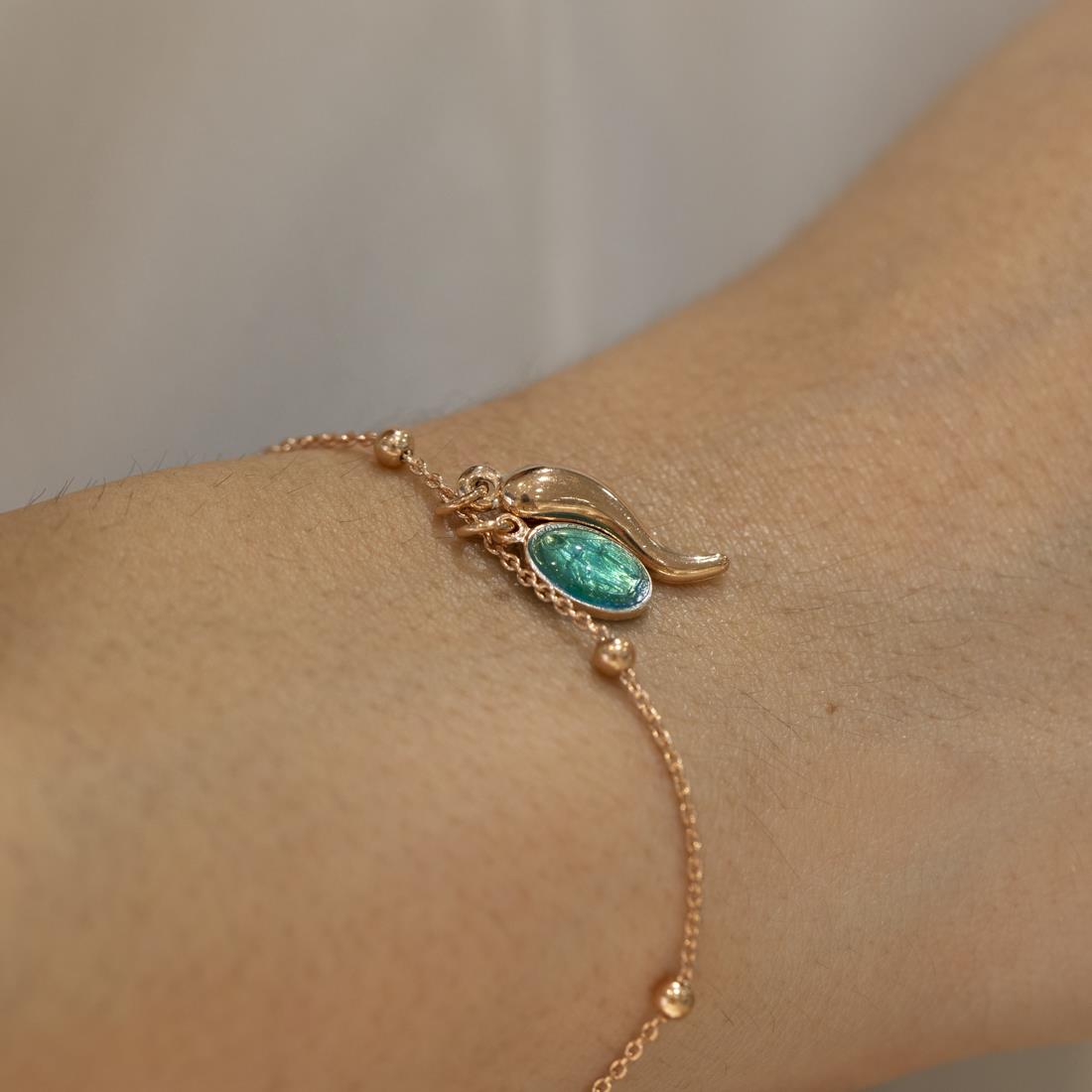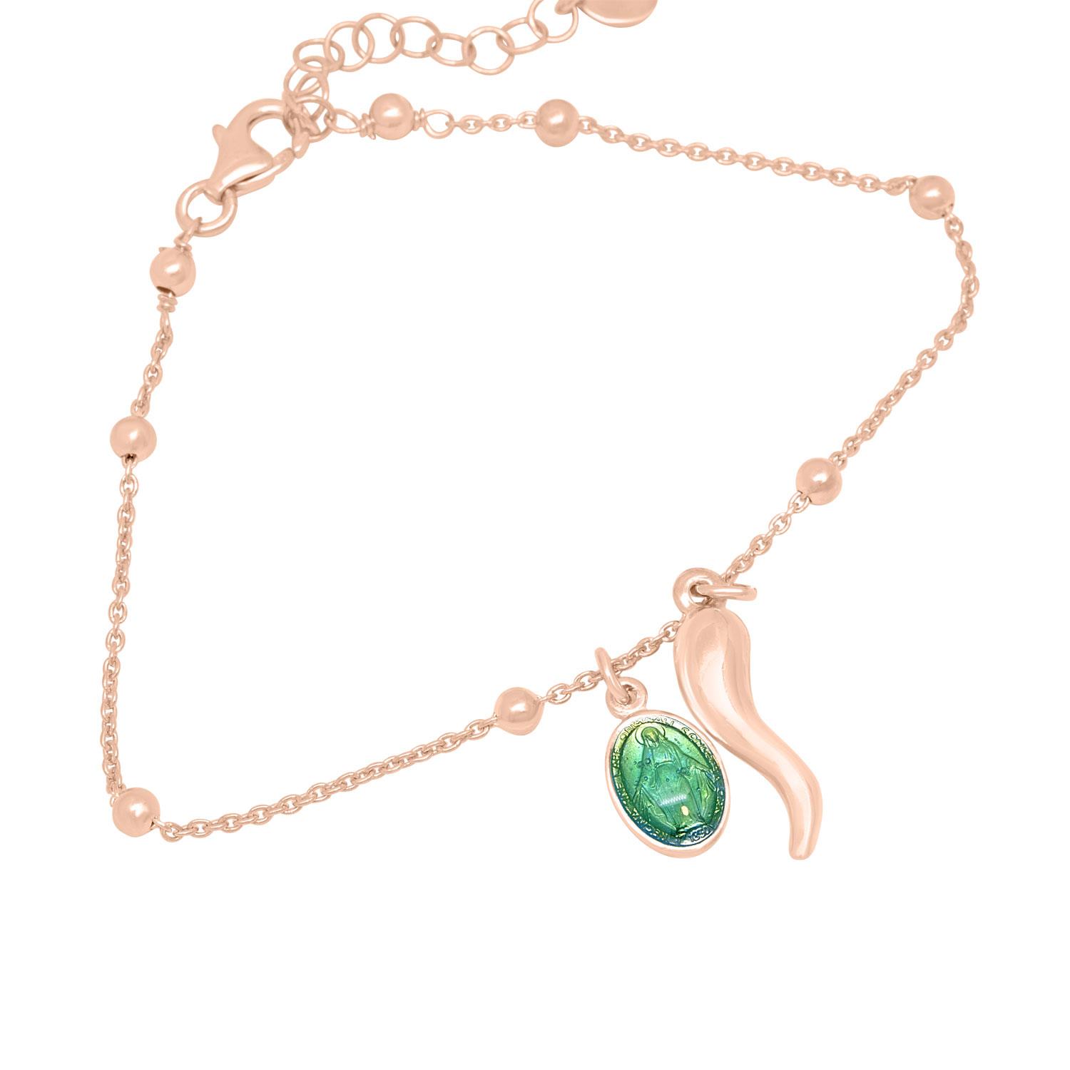 Pulsera de diseño ORO&CO en plata rosada con croissant y colgante verde, longitud 16-20