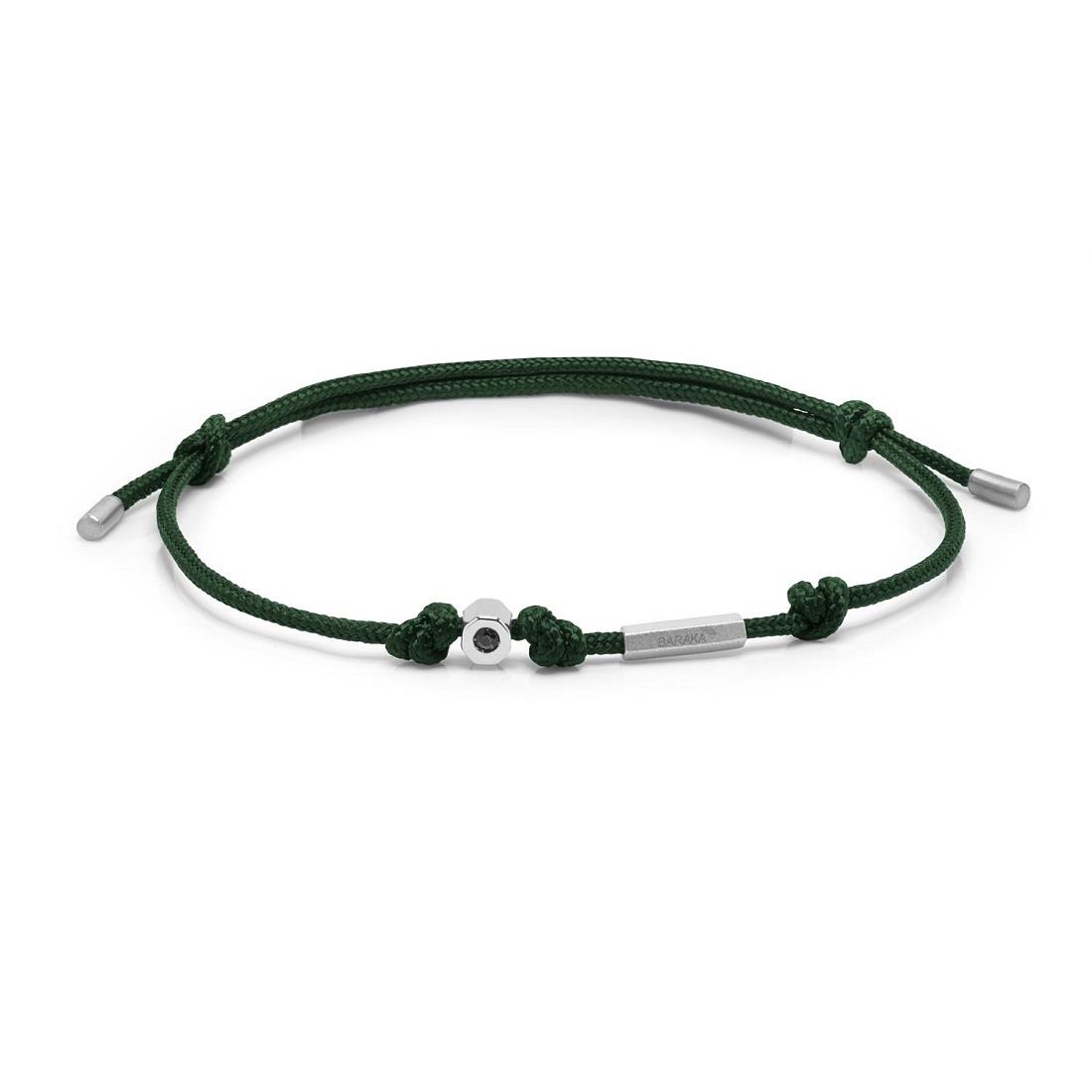 Pulsera para hombre Barakà en oro blanco y diamantes negros ct. 0,06 con cordón ajustable de algodón verde.