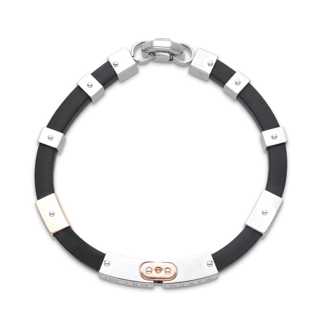 Pulsera semirrígida para hombre Barakà en oro rosa y caucho. Cierre en oro blanco y rosa con diamante ct. 0,02. Largo 19cm.