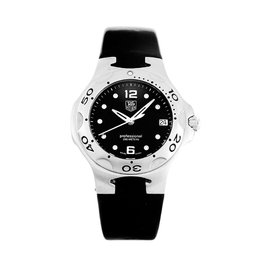 Reloj Tag Heuer. Caja de acero inoxidable de 36 mm, esfera negra, movimiento de cuarzo, cristal de zafiro, correa de caucho negro, resistente al agua hasta 200 metros.