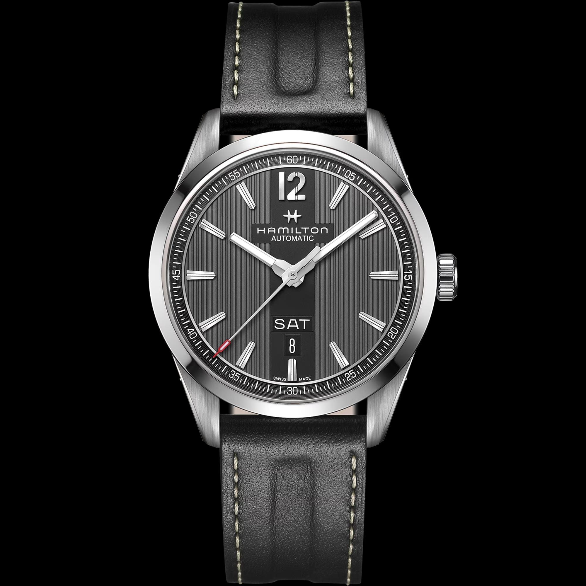 Reloj Hamilton Broadway Date con caja de acero de 42 mm, esfera negra, correa de piel negra, cierre de pasador. Movimiento automático, reserva de marcha de 80 horas, cristal de zafiro, resistencia al agua hasta 50 m.
