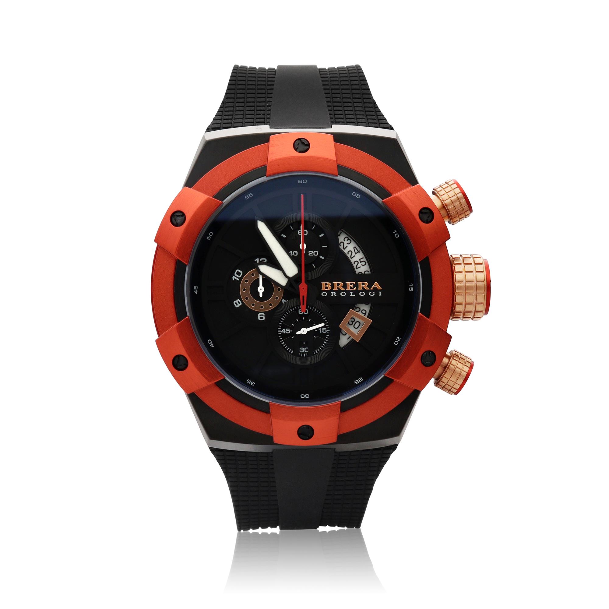 Reloj cronógrafo de cuarzo de la colección Supersportivo de Brera. Caja de acero inoxidable de 48 mm de diámetro y 15 mm de grosor, bañada en negro. Esfera multilivel negra con manecillas de alta luminosidad, cristal mineral y bisel bañado en rojo intercambiable con tornillos de diseño Brera. Corona a rosca de 10 mm. Correa de goma silicona negra con hebilla de acero inoxidable bañado en negro. Movimiento japonés Miyota y resistencia al agua hasta 10 ATM.
