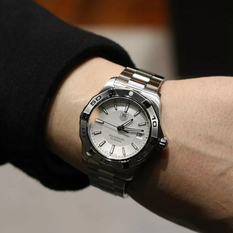 Reloj Tag Heuer Aquaracer para hombre en acero, caja de 39 mm, esfera plateada. Movimiento de cuarzo alimentado por pilas. WR 30ATM
