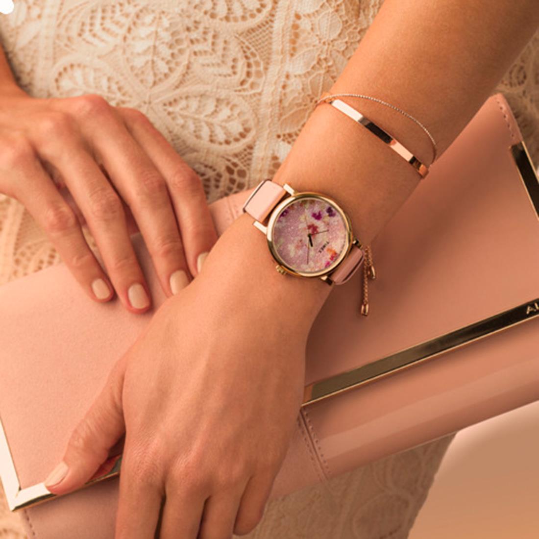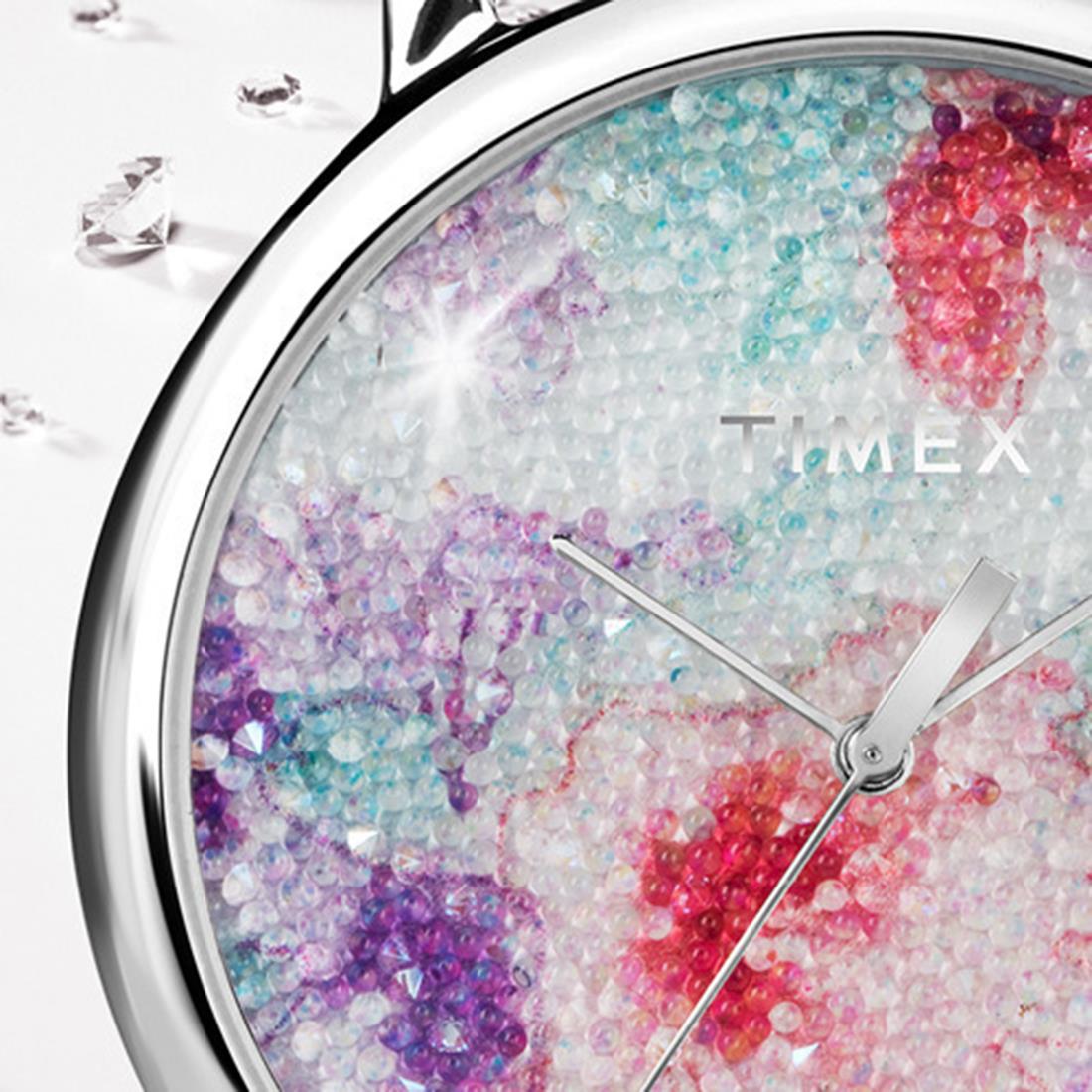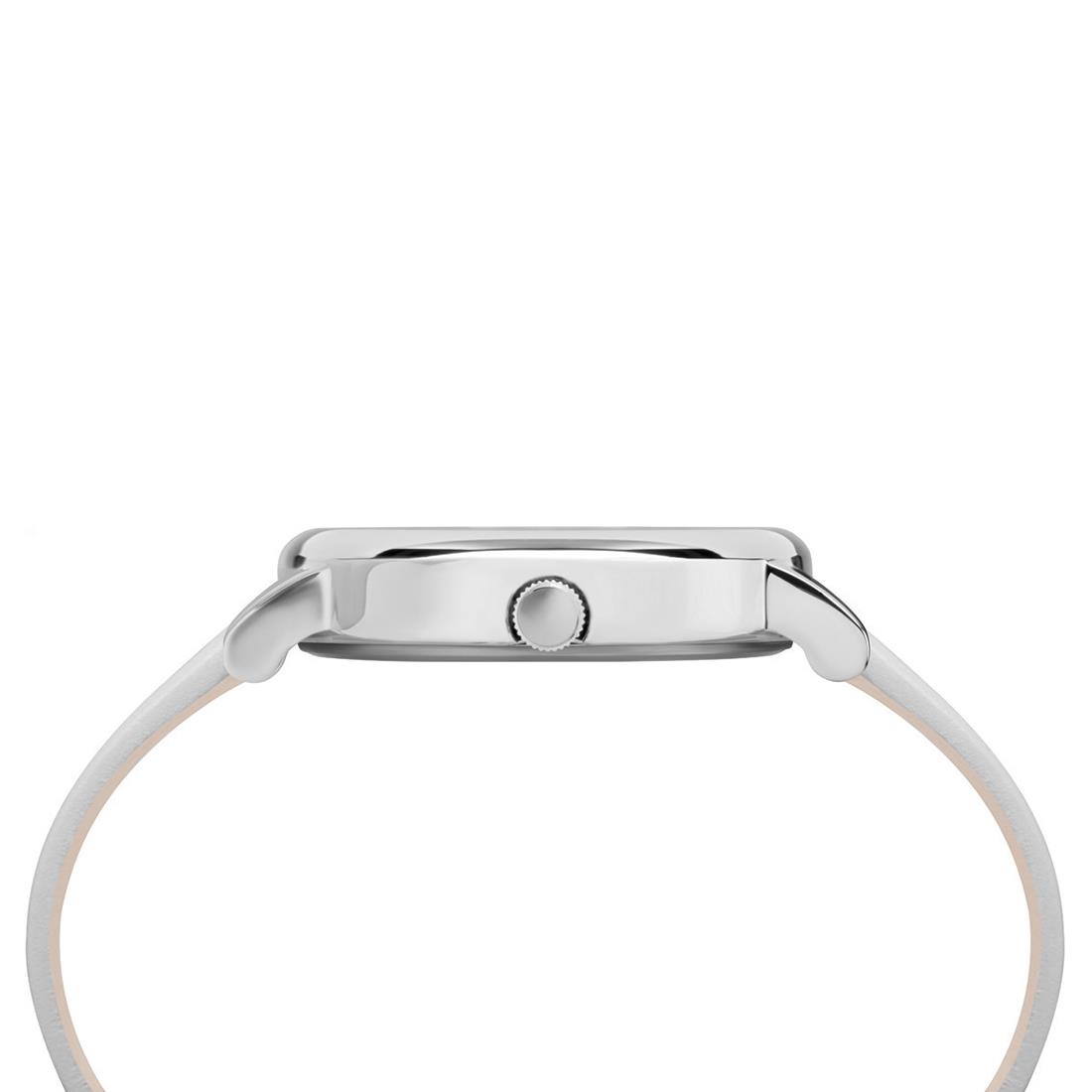 Reloj Timex. Caja de 38 mm de Crystal Bloom en latón, esfera blanca con svarowsky, movimiento de cuarzo, cristal mineral, correa de piel blanca, resistente al agua 3 atm.