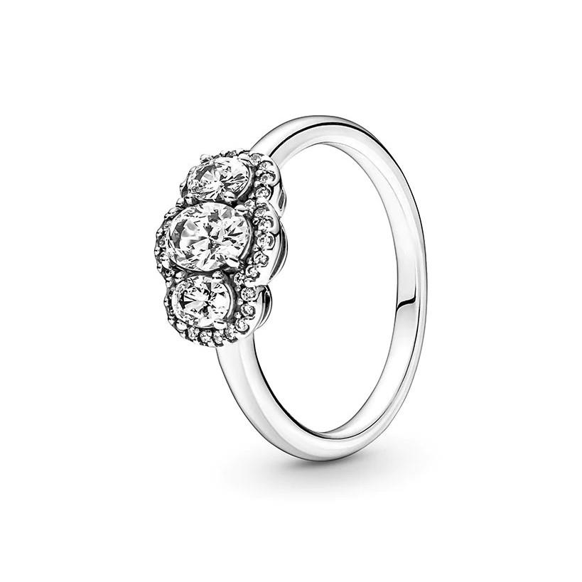 Anello Pandora collezione Timeless in argento925 con tre punti luce centrali, decorati da pietre di zirconia cubica incolore con taglio ovale. Misura 12