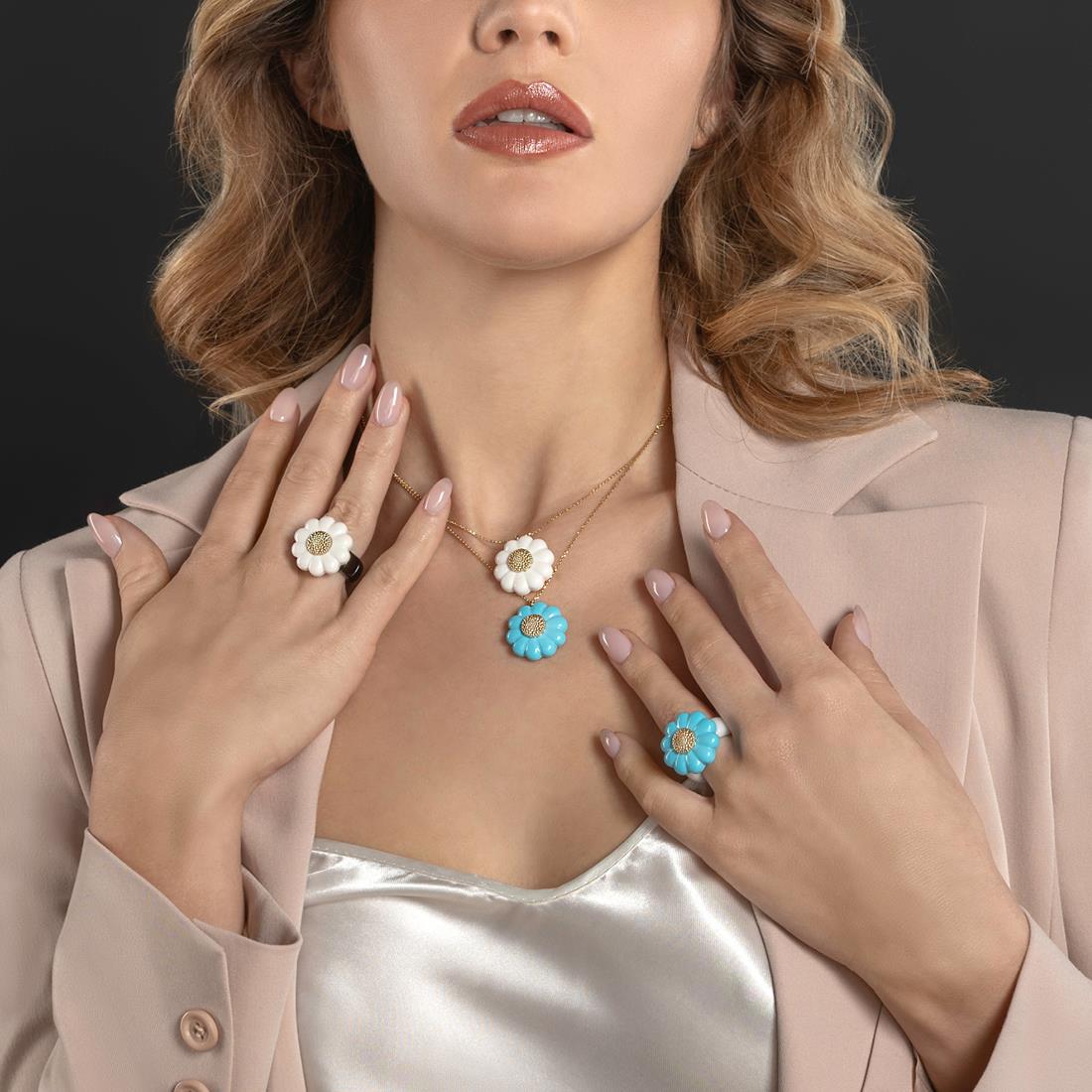 Anello Roberto Demeglio semirigido con gambo elastico in ceramica bianca lucida, margherita in pasta di turchese e dettagli in oro e argento