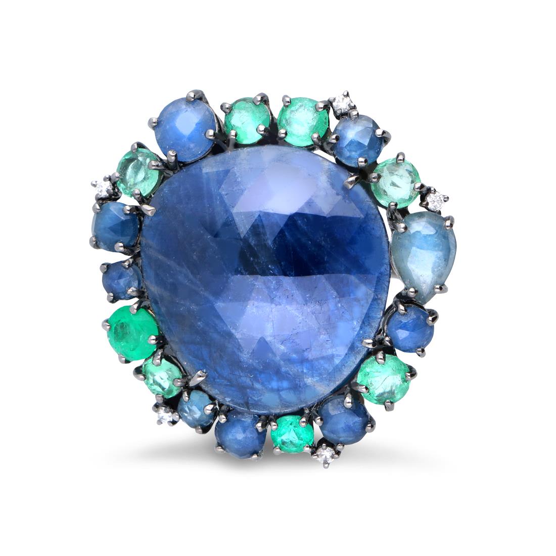 Anello in oro brunito con zaffiro blu, smeraldo ct.1.44 e diamanti ct. 0.09 - ALFIERI & ST. JOHN