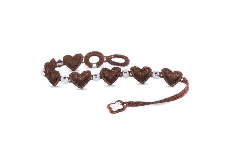 Bracciale Cruciani Damiani in tessuto marrone limited edition, con cuori ed elementi in argento con diamanti ct 0,01